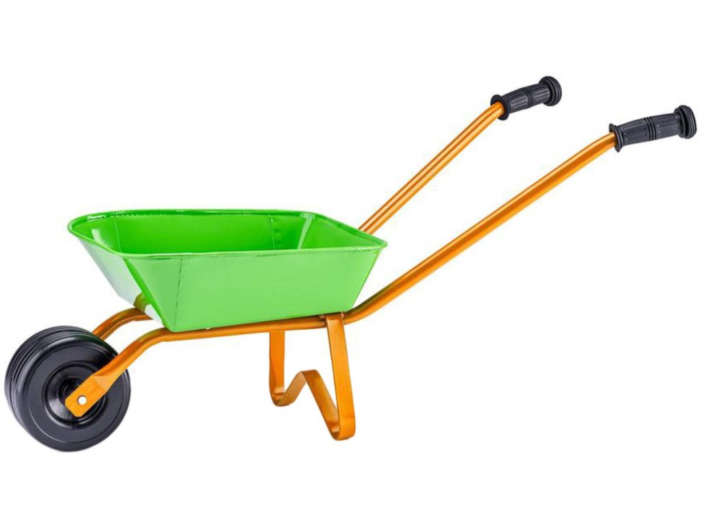 Kvalitní dětské zeleno-oranžové plechové kolečko Merkur. Pevná kovová konstrukce, pogumovaná rukojeť, kolo z tvrdého plastu. Vhodné na pískoviště nebo zahradu.