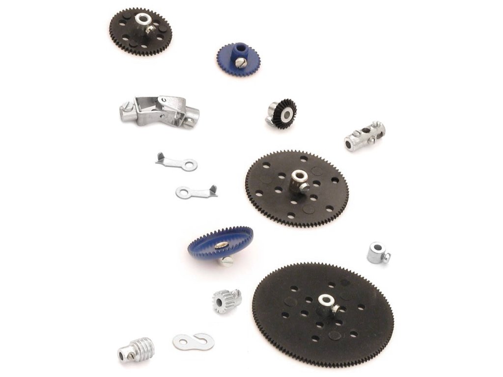 Doplňková sada ke stavebnicím, která obsahuje malé a velká ozubená kola, kuželová kola, pastorky, šnek, korunkové kolo, kardanové klouby a další potřebné dílky.