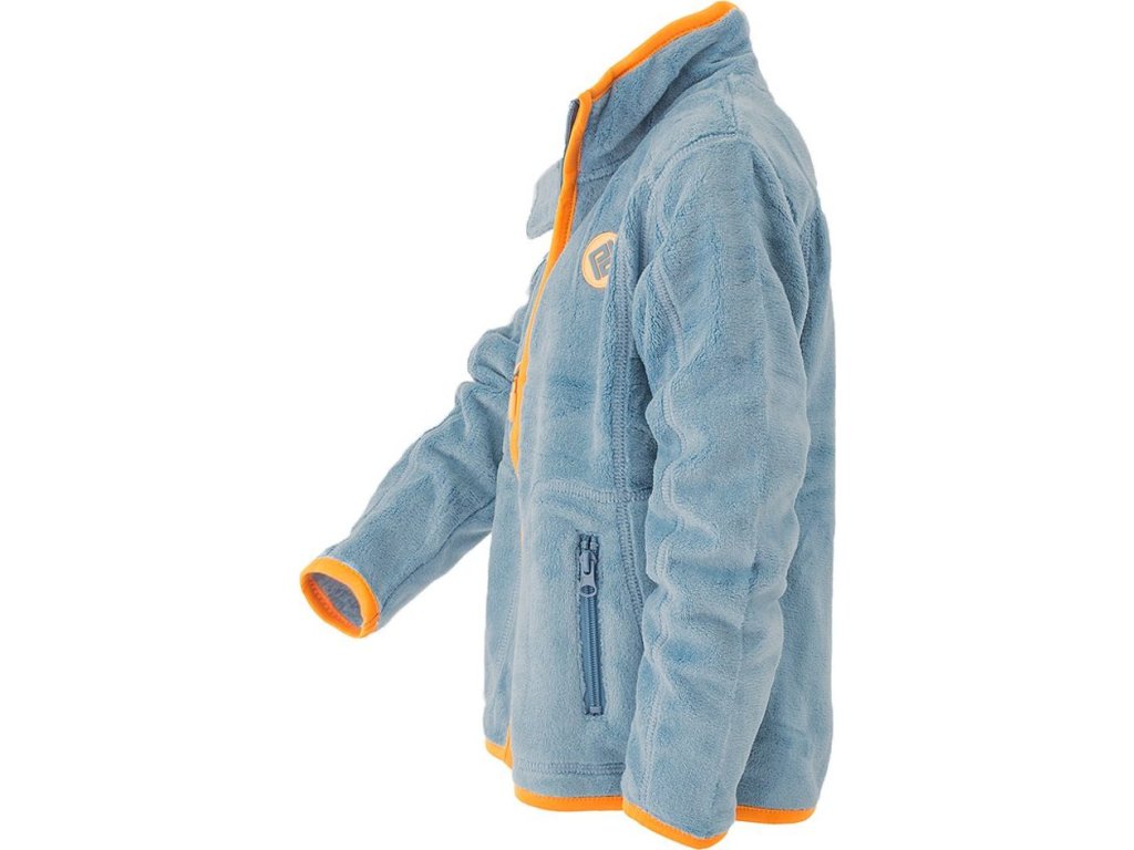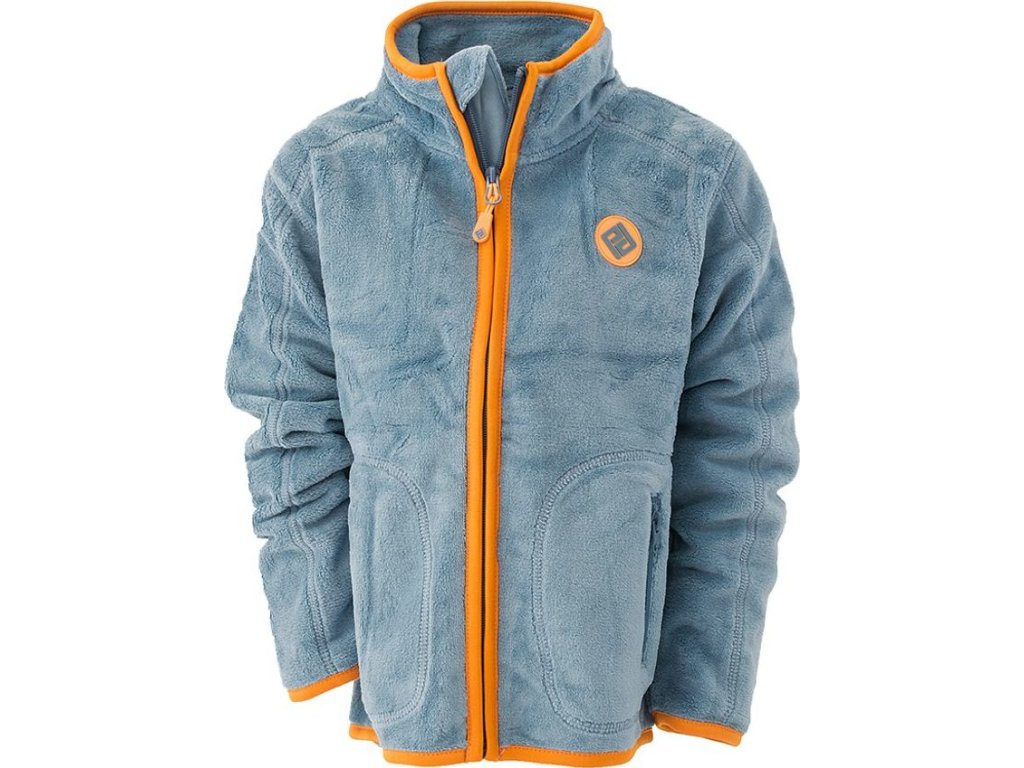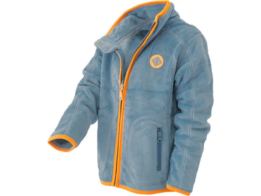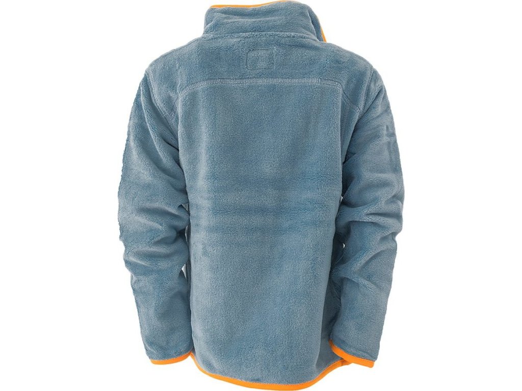 Chlapecká propínací chlupatá mikina v modré barvě. Stojací límec, dvě kapsy, barevné kontrastní lemy.