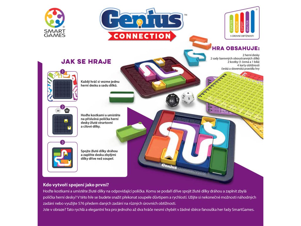 Genius Connection je dynamický a variabilní logický rébus, který můžete hrát hned ve dvou režimech: buď sólově jako klasický hlavolam, nebo jako napínavou hru pro dva hráče. Kombinuje v sobě prvky prostorového skládání dílků s úkolem propojit startovní a cílové body vyznačenou dráhou. Hra je ideální pro ty, kteří mají rádi výzvy a zároveň si rádi poměří síly s protihráčem v rychlosti a logickém myšlení.