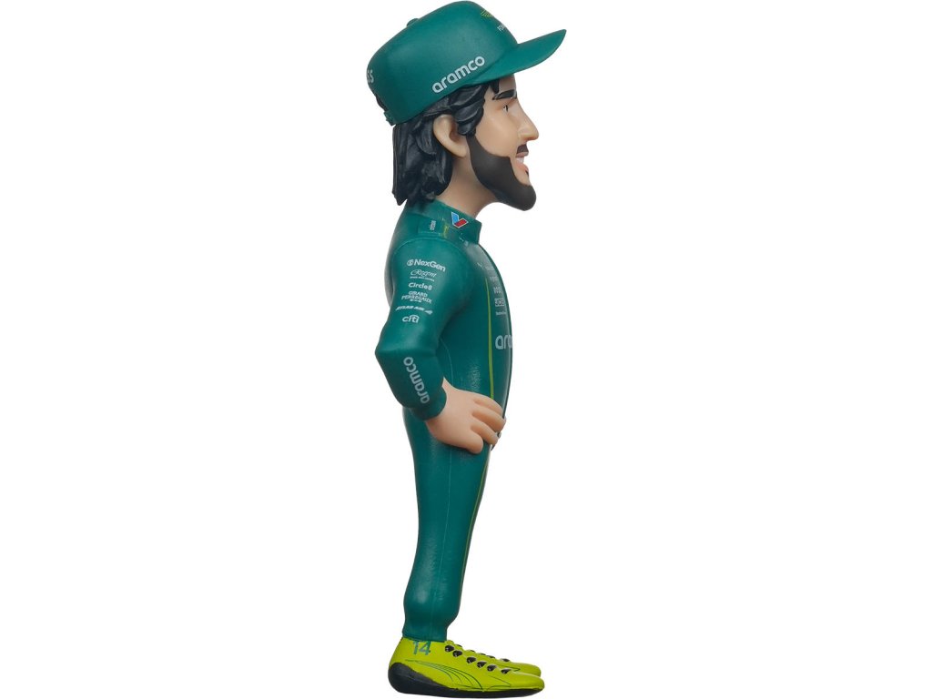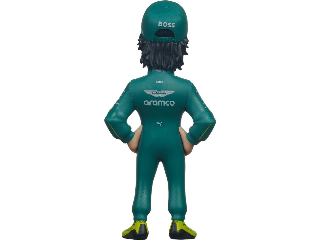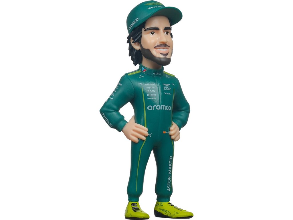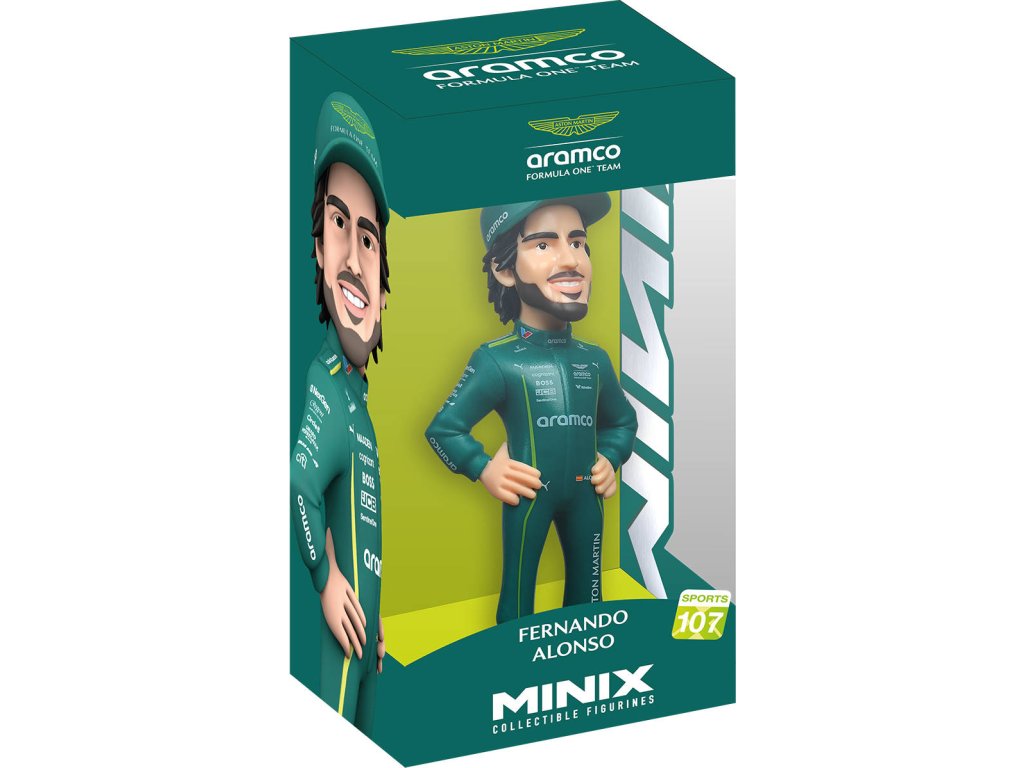 Minix Sports automobilový závodník, závodní jezdec Fernando Alonso (Aston Martin), charakteristická plastová sběratelská figurka č. 107 pro všechny fanoušky Formule 1. Baleno v krabičce s průhledem.
