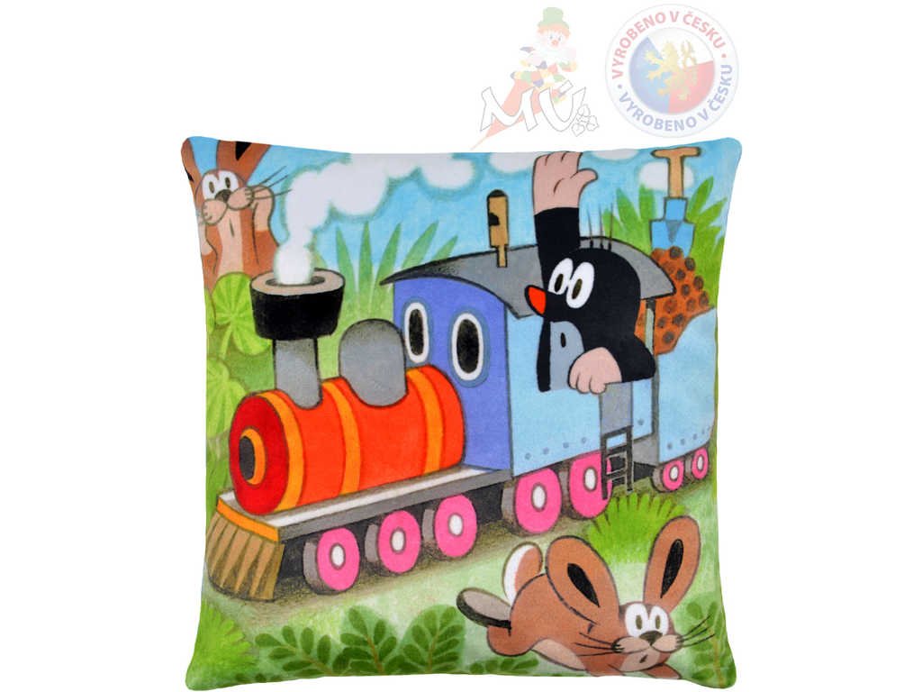 Měkoučký polštářek s motivem oblíbeného Krtečka a mašinky, vhodný do postýlky, na cesty i jako dekorace do pokojíčku, s obrázkem (tisk).