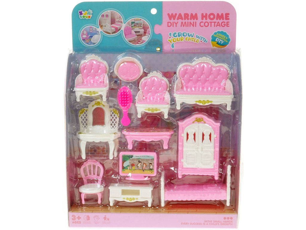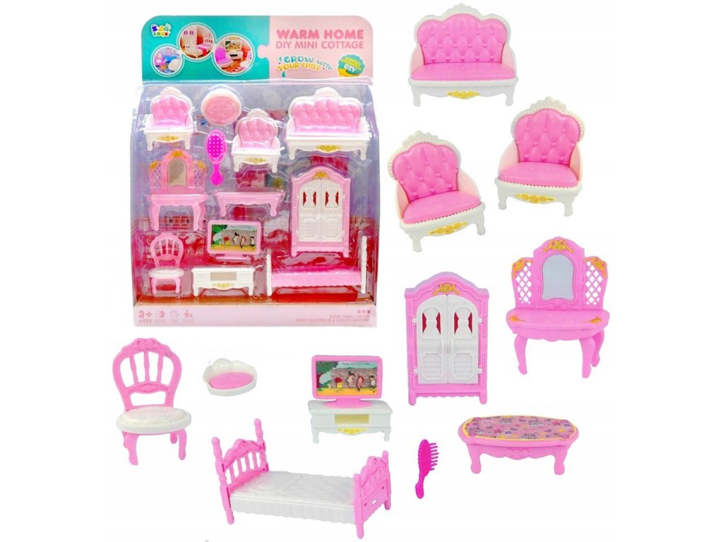 Obsah balení: kosmetický stoleček, 2 stoly, televizor, pohovka, 2 křesla, skříň, hřeben, pelíšek pro domácího mazlíčka, postel, židle