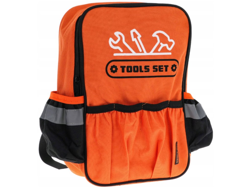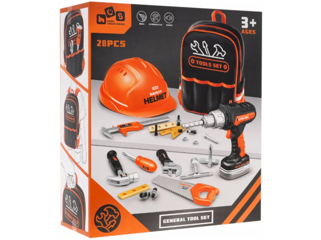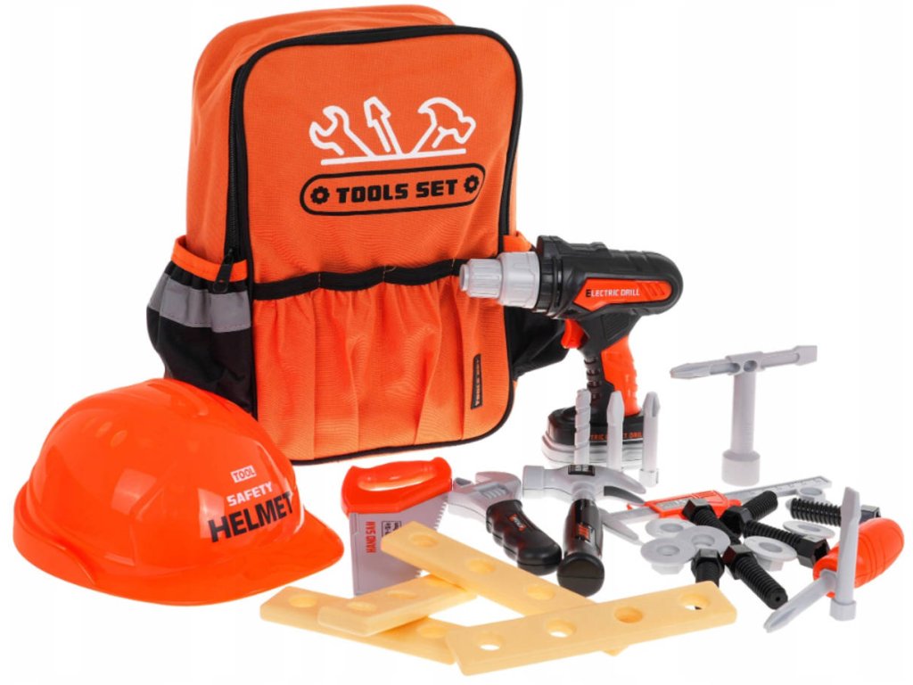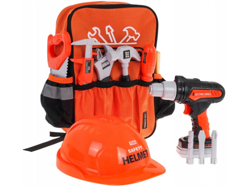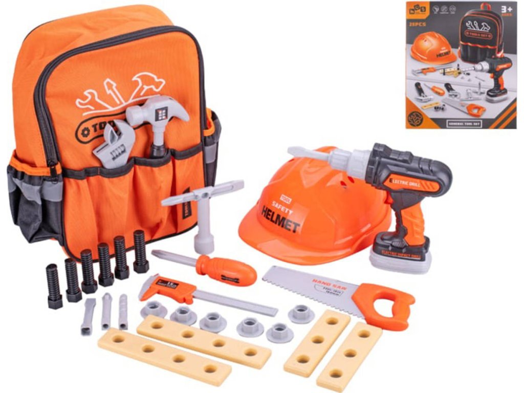 Obsah balení: batůžek, ochranná helma, dětské pracovní nářadí s doplňky (vrtačka, pilka, kladívko, francouzský klíč, šroubovák, šroubky a matice ... )