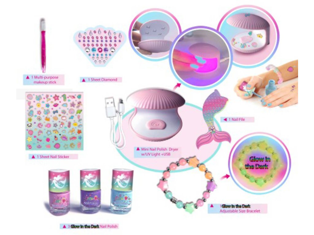 Nádherná sada nehtového studia, která obsahuje 3 slupovací laky na nehty, ozdobné kamínky, nálepky, ve tmě svítící náramek a uv lampu v krásném balení. K lampě je v balení součástí usb kabel, nevyžaduje baterie, pouze zdroj napájení. Zažij spoustu zábavy a ozdob sebe i kamarádky.