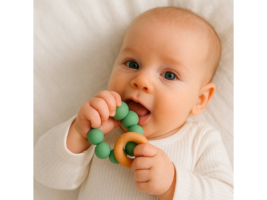 Přírodní materiály: Vyrobeno z kombinace dřeva a měkkého, bezpečného silikonu (bez BPA), který je šetrný k dětským dásním.