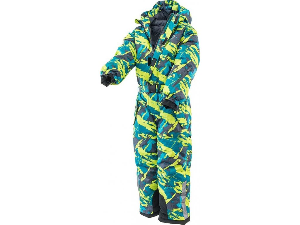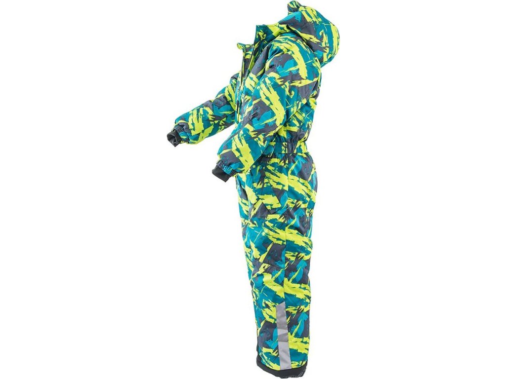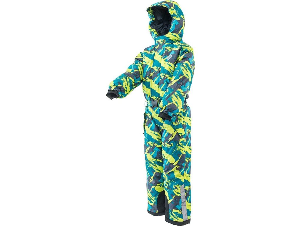 Rukávy jsou ukončené stahovacím páskem na suchý zip (lze regulovat dle potřeby), uvnitř rukávu elastický úplet s otvorem na palec. Overal má dvě boční kapsy, hřejivou výplň, efektní hladkou podšívku, pevnou kapuci, která je vybavena praktickou gumou a kšiltem proti dešti a sněhu. Nohavice jsou vybaveny vnitřními návleky s légou a reflexním páskem. Vnitřní část nohavic a lem je vyroben z otěruvzdorné materiálu se zvýšenou odolností. Reflexní potisk na přední i zadní části.