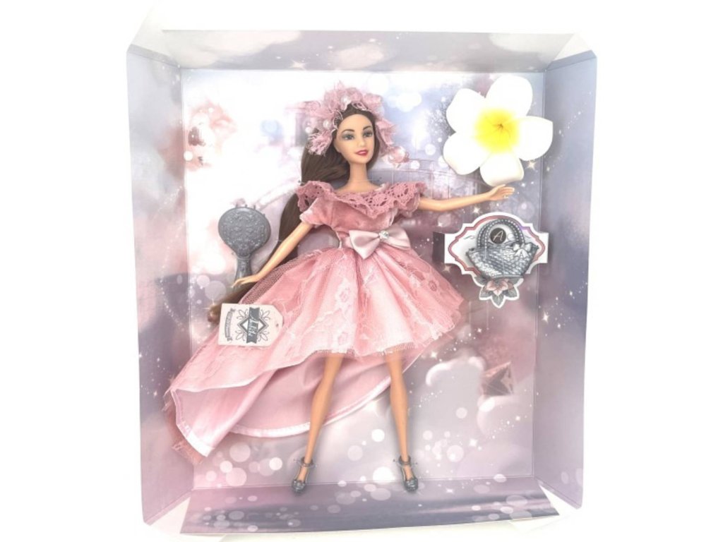 Panenka Anbibi růžové šaty dlouhé tmavé vlasy set s doplňky