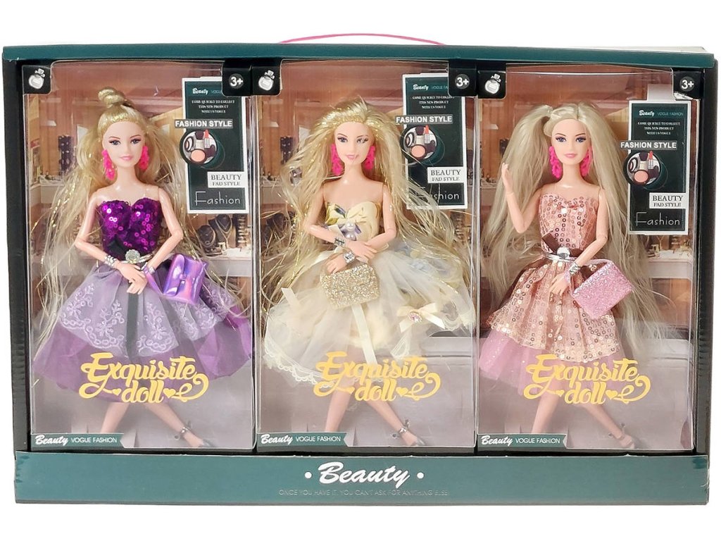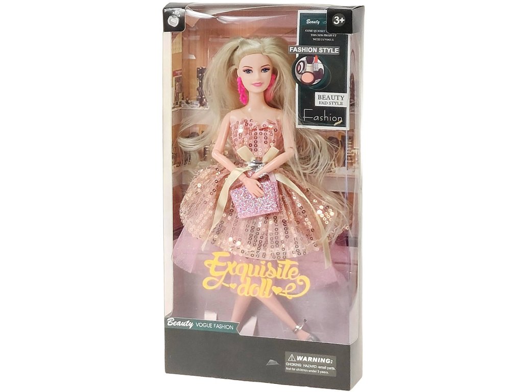 Fashion panenka blondýnka ve stylových třpytivých plesových šatech se třpytkami, s kabelkou a náušnicemi. Velikost 29cm, 3 barevné varianty.