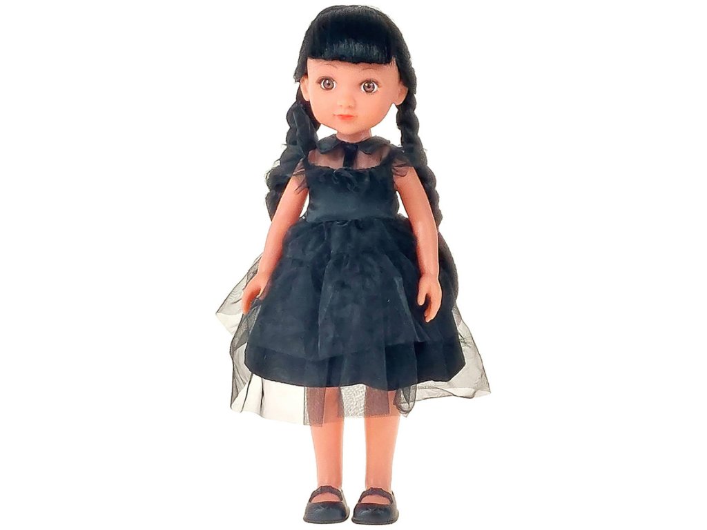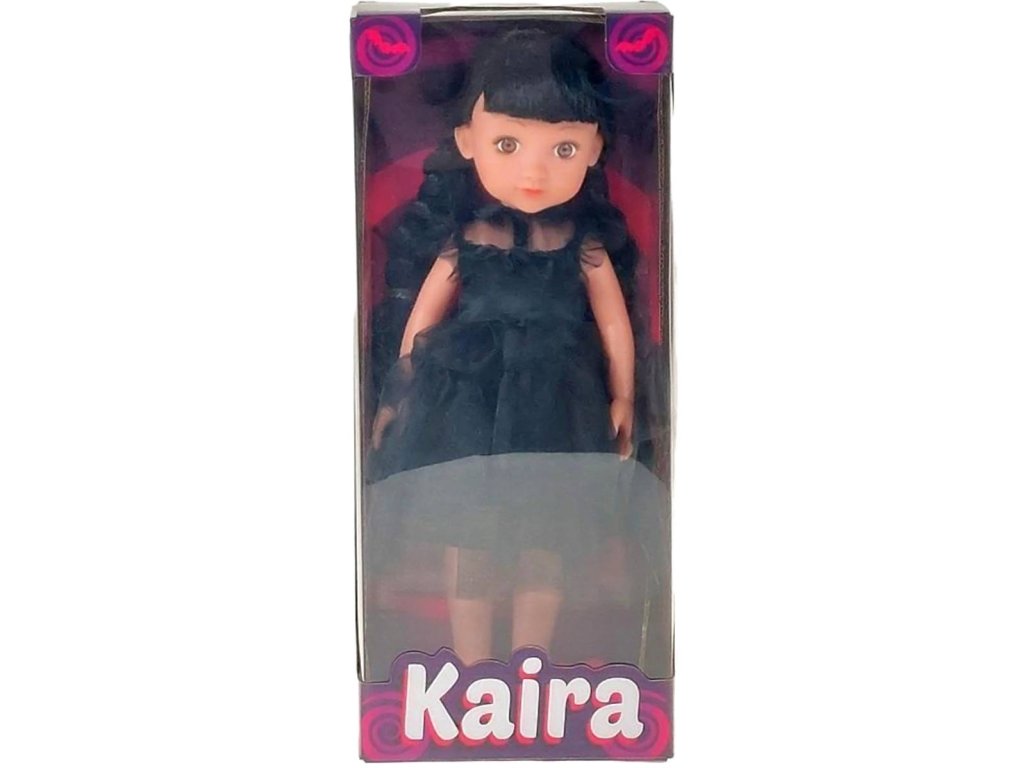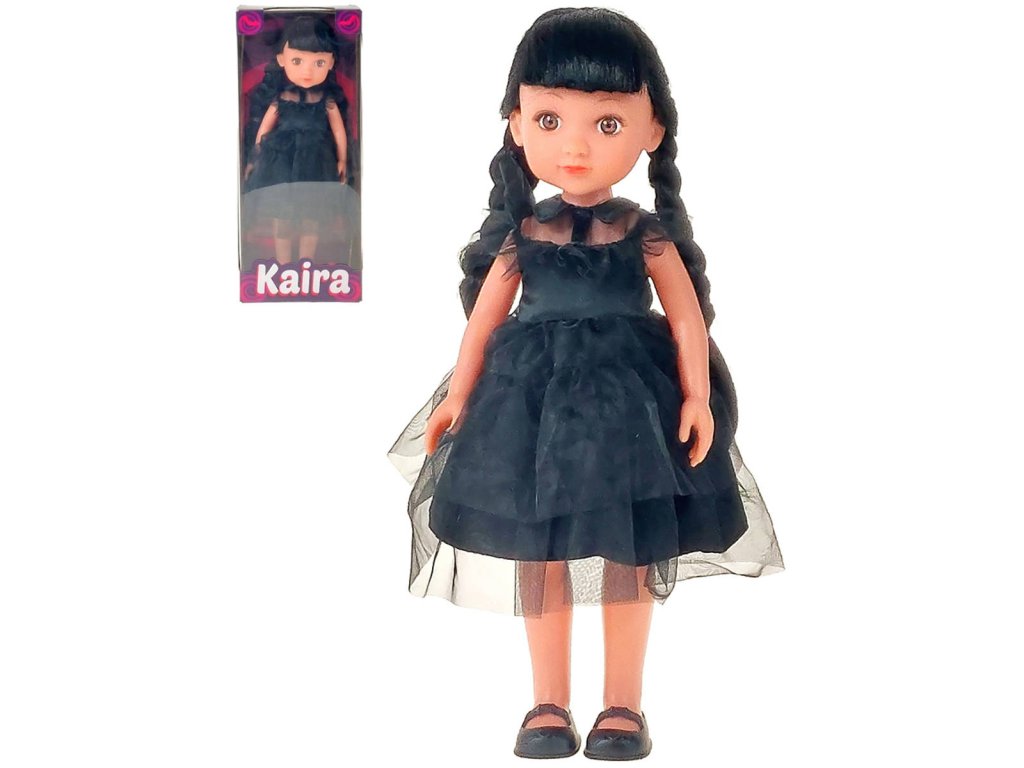 Panenka Kaira černovláska s copánky v černých šatech v krabici