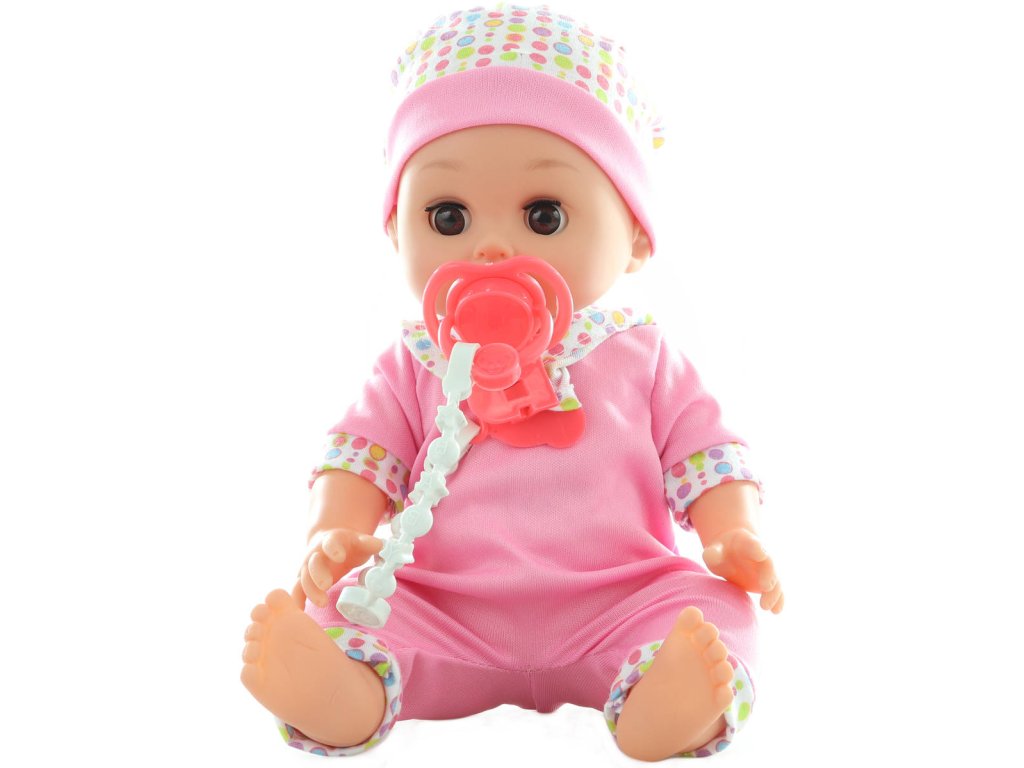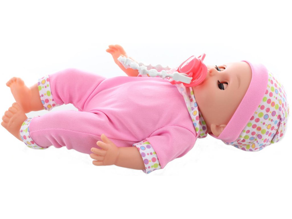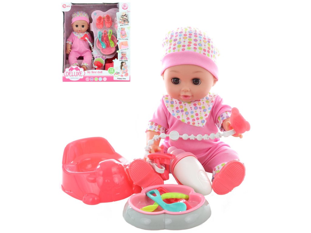 Panenka miminko o velikosti 28cm. Vydává zvuky, pije a čůrá. Součástí nočník, lahvička, šidítko a talířek s příbory. Hračka na baterie, se zvukem.