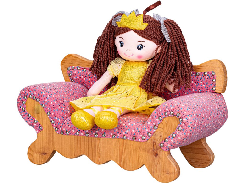 Textilní panenka Princezna Lenka o velikosti 35cm. Mluví (zpívá) česky motivy z pohádky Princové jsou na draka. Hadrová panenka, měkké tělíčko, na baterie, se zvukem.