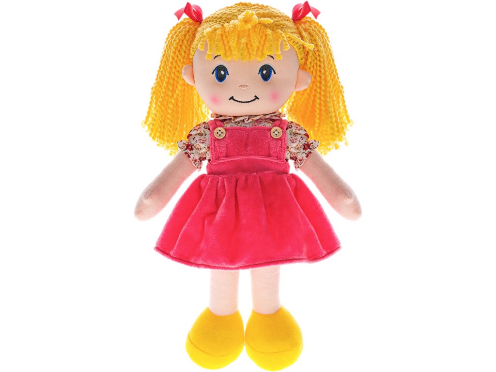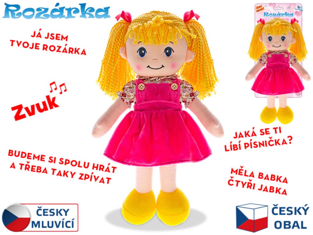 Veselá plyšová textilní měkká panenka Rozárka s copánky, v krátkých šatičkách, pro nejmenší děti. Česky mluvící CZ. Hračka se zvukem na baterie.