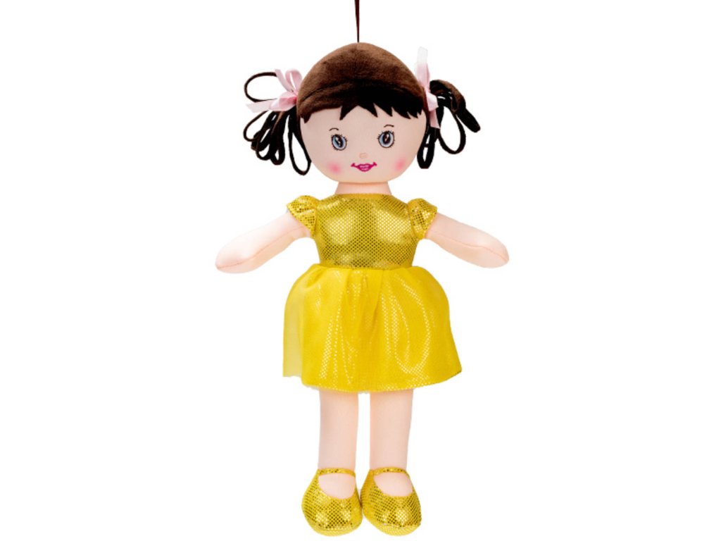 Viktorka - měkká textilní usměvavá panenka s copánky, v krátkých žlutých třpytivých šatičkách, česky mluvící, vhodná i pro nejmenší děti. Hračka na baterie, se zvukem CZ.