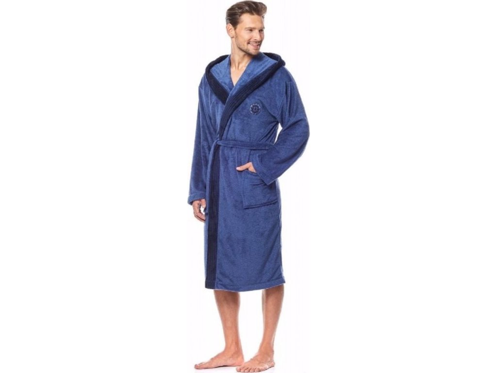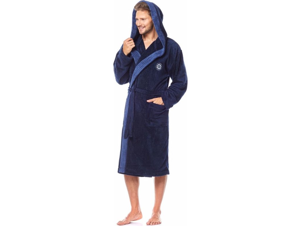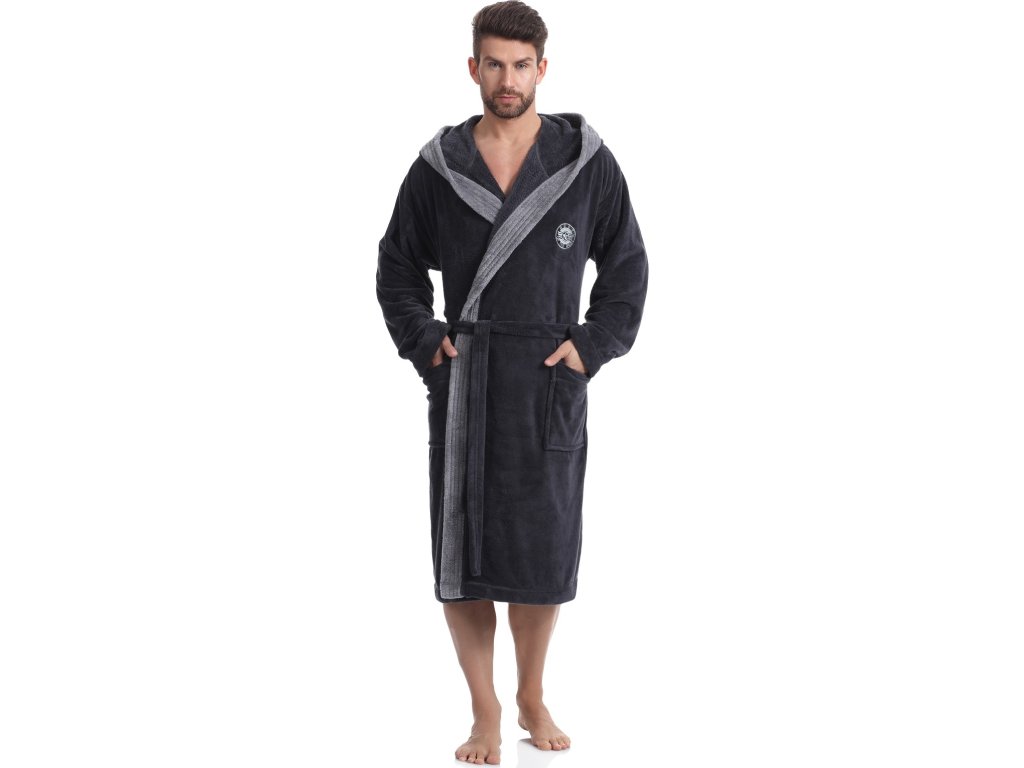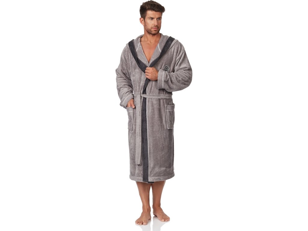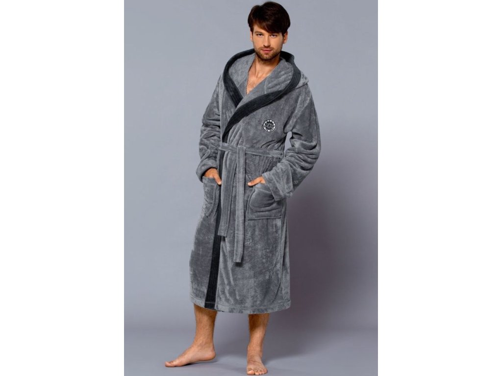 Pánský župan se zavazováním v pase. Župan je vyrobený z měkké tkaniny (soft). Model má na bocích kapsy, má kapuci a na hrudníku ozdobnou aplikaci.