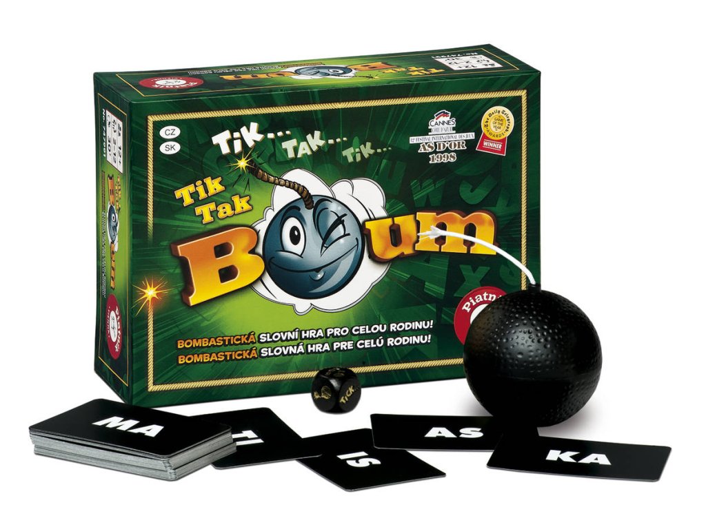 Rychlá slovní společenská hra Tick Tak Bum! podporuje kreativitu, spontánnost a slovní zásobu. Společenská hra TIK TAK BUM! dokáže rozjet pořádný večírek. V ruce vám tiká bomba se speciálním časovačem, který způsobí, že bomba exploduje vždy v jiném intervale v rozmezí 10 - 60 vteřin. Nikdo tedy neví, jak dlouho bomba bude tikat, než vybuchne. Hráči hledají a vymýšlejí slova, obsahující dané slabiky, a přitom si přehazují tikající bombu. Komu bomba vybuchne v ruce, ten prohrává. Každý se chce co nejdříve zbavit tikající věci, než vybuchne. Rozhoduje rychlá reakce a správné slovo ve správnou chvíli!