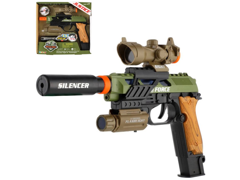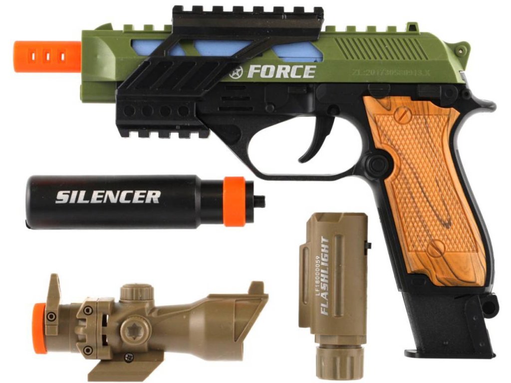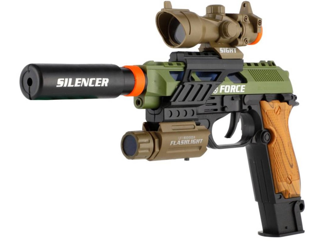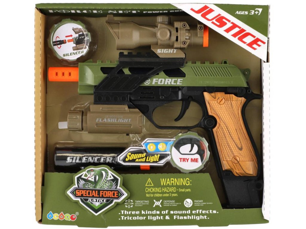 Pistole je reálně vypadající, ale bezpečná zbraň z plastu, a bude se zajisté líbit všem klukům, kteří mají rádi zbraně. Pistol vydává 3 různé zvuky a svítí a v sadě najdete i zaměřovač, světlo a tlumič.