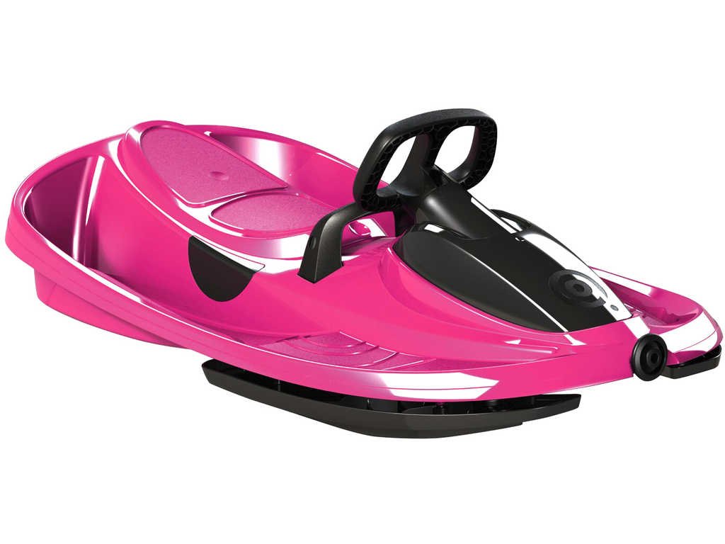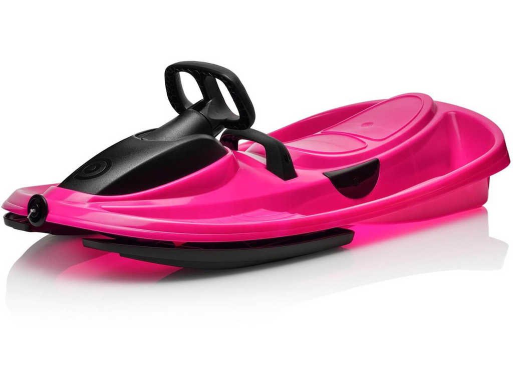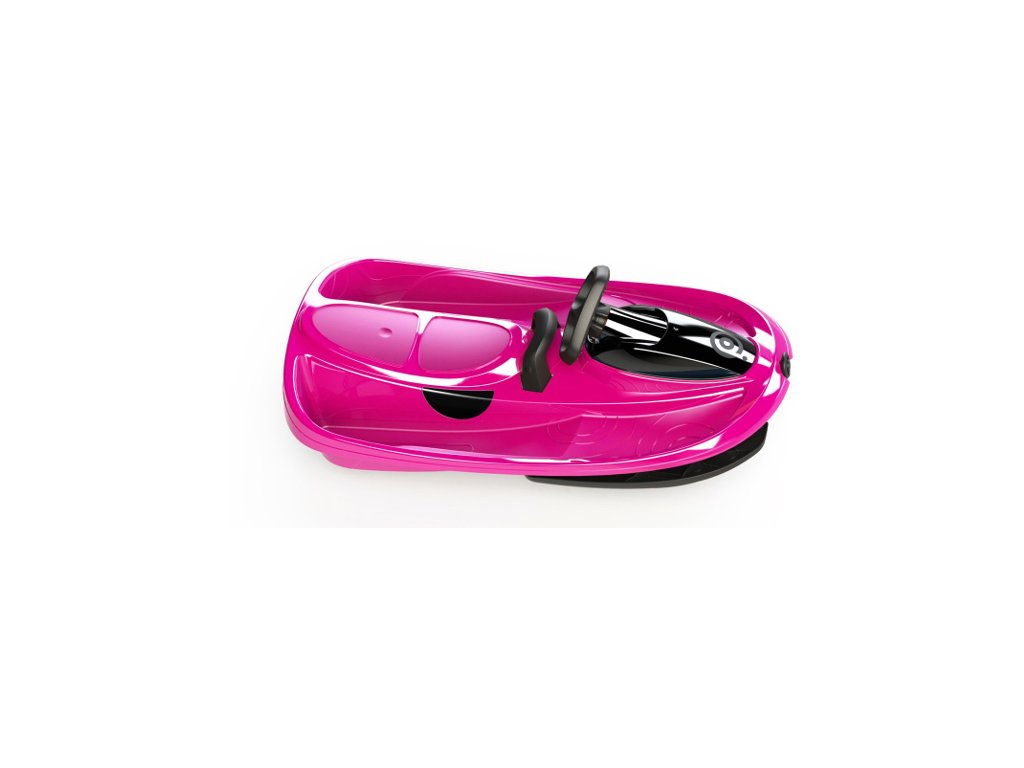 Luxusní a kvalitní plastový řiditelný bob STRATOS dvoumístný, v růžovo-červeném provedení, pro děti na sníh. Zatáčení pomocí diferenciálu zvyšuje rychlost v zatáčkách, protože každá