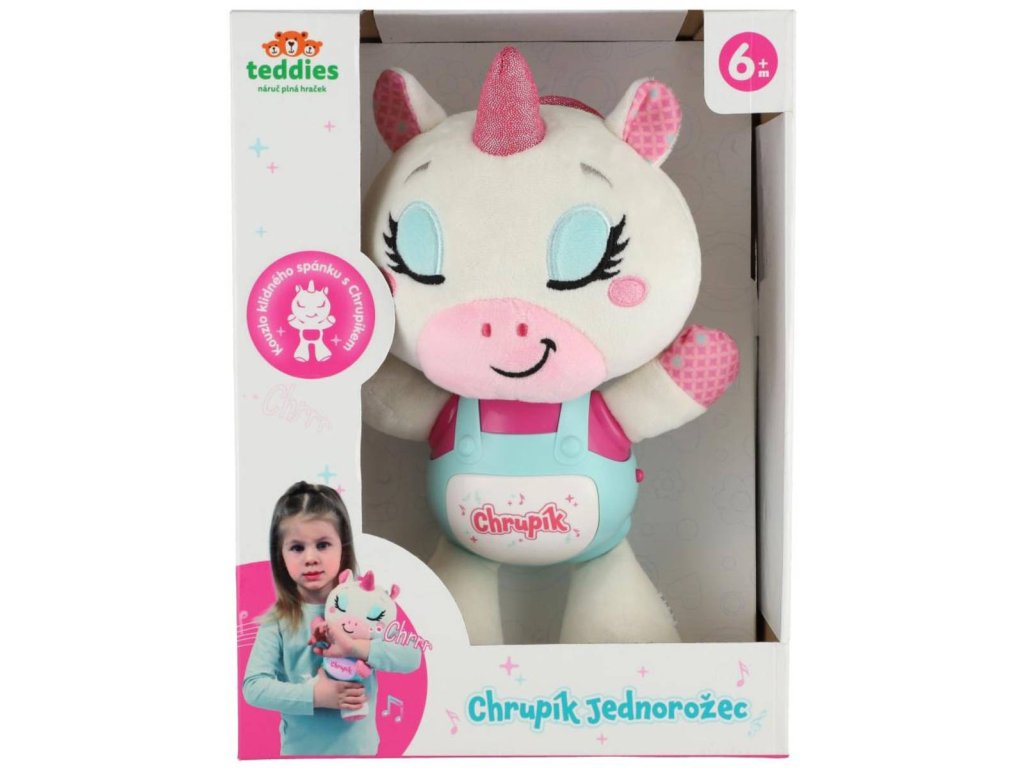 Jednorožec Chrupík – kouzelný usínáček se světlem a zvuky pro klidné večery. Usínání bude odteď pro děti kouzelným zážitkem. Roztomilý Jednorožec Chrupík kombinuje mazlivého plyšového kamaráda s uklidňujícím světlem a zvuky. Je ideálním společníkem pro večerní rituály a první samostatné usínání. Jednorožec je vyroben z hebkého plyše a má plastový panel se světelnými a zvukovými efekty. Po stisknutí tlačítka zahraje jemnou melodii, která uklidní dítě a podbarví příjemnou atmosféru tlumeným světýlkem. Díky napájení na baterie lze hračku snadno používat kdekoliv – v postýlce, kočárku i na cestách.