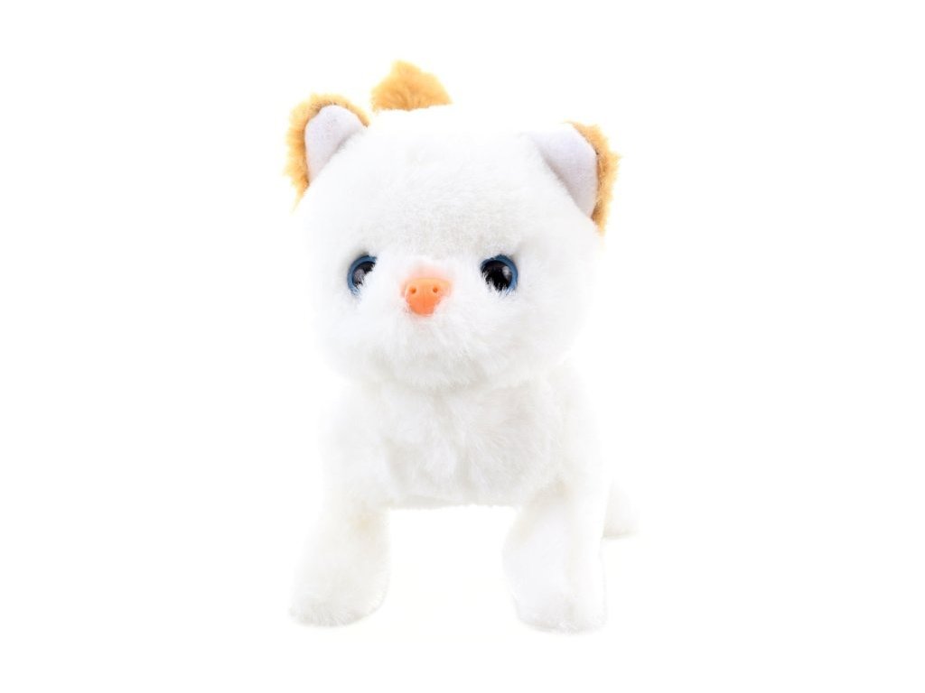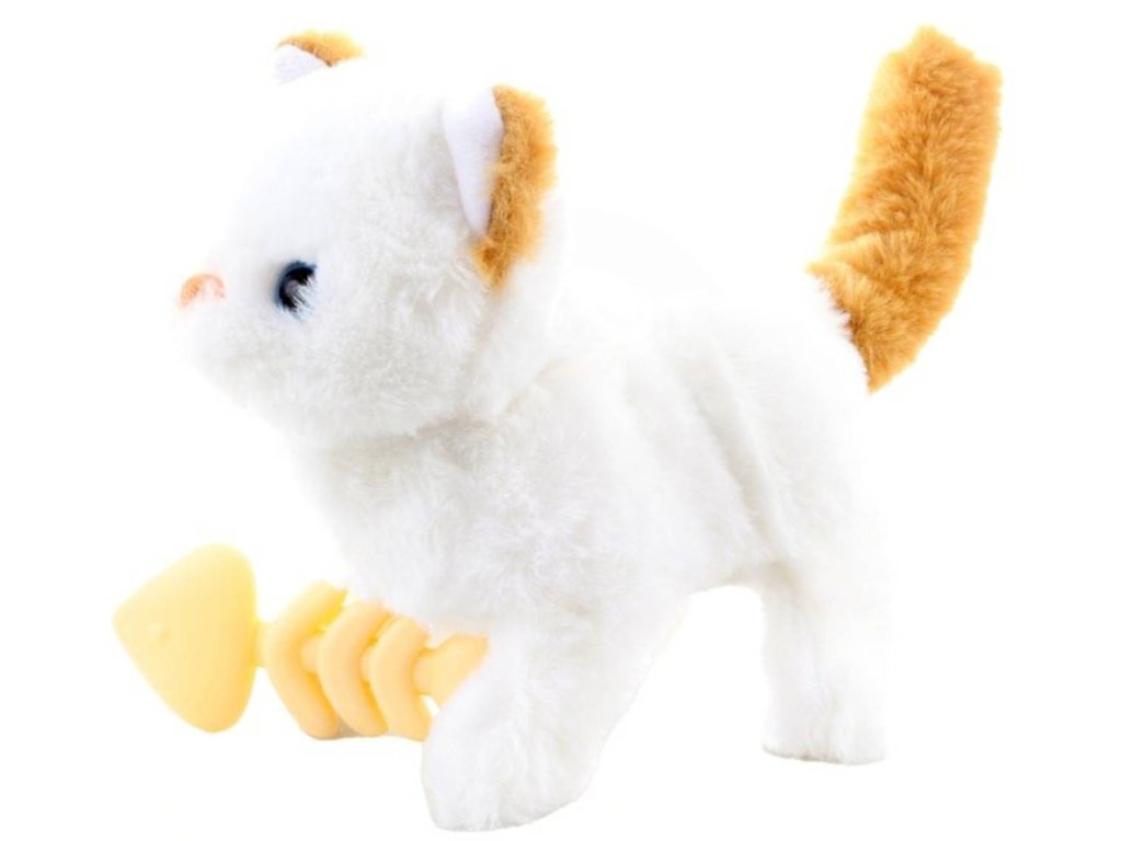 Plyšová, chodící, bílá kočka na baterie. Po zapnutí kočička chodí, hýbe hlavou a ocáskem a vydává zvuky - mňouká. Baleno v otevřené krabici ve tvaru boudičky. Součástí balení je plastová rybí kostra. Velikost 22cm. Hračka na baterie, se zvukem.