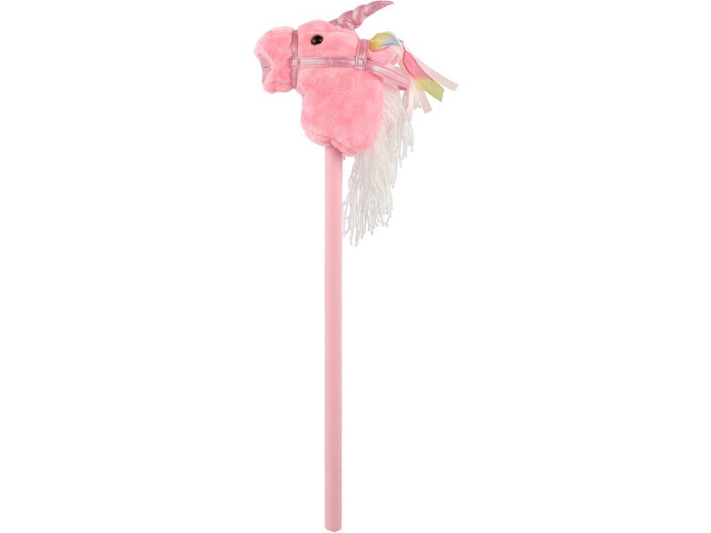 Plyšový kůň jednorožec růžový na tyči, celková délka 80cm, koňská hlava na baterie, se zvukem.
