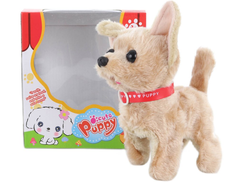 Světle hnědý psík z plyše, který umí chodit, štěkat a pohybovat hlavičkou. Tvůj první, čtyřnohý kamrád! Pejsek chodí, štěká a pohybuje hlavou. Pes na baterie, se zvukem. Velikost 16cm.