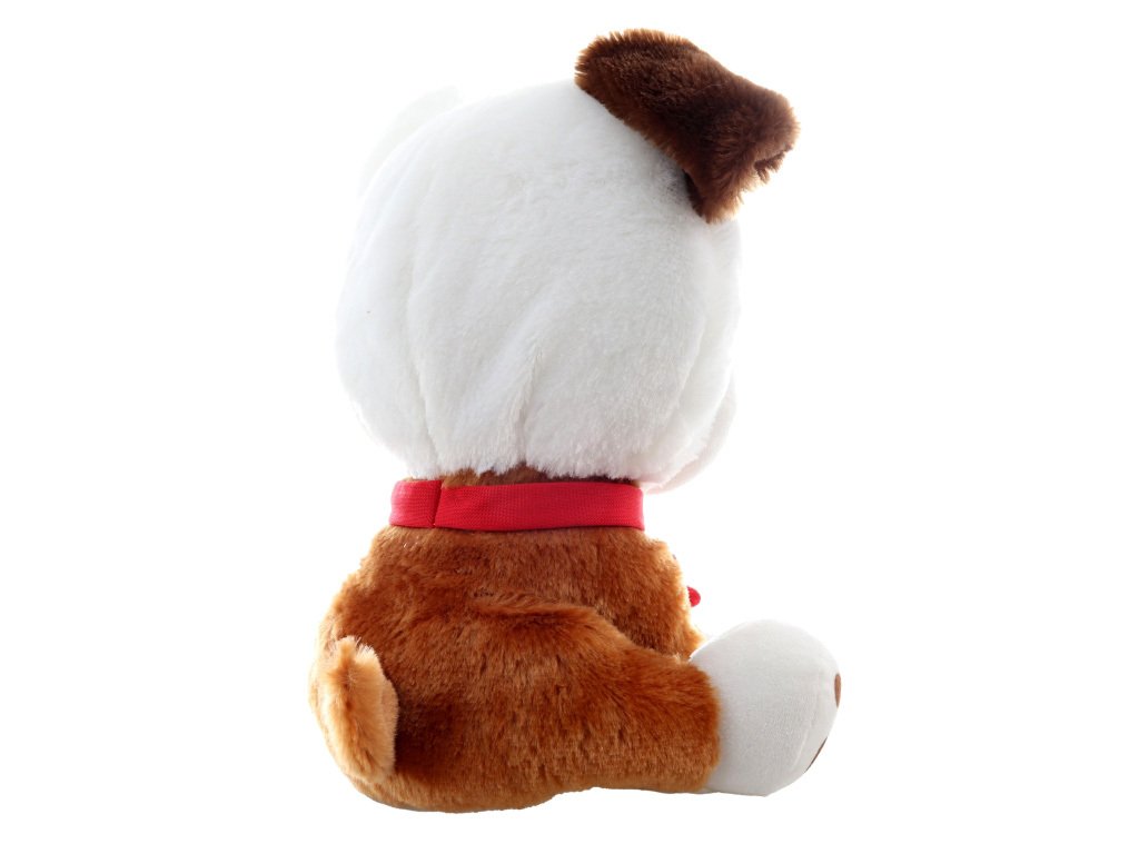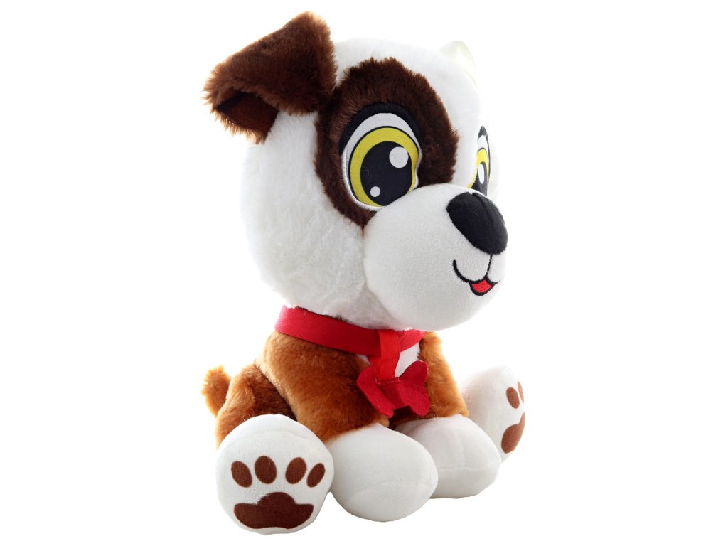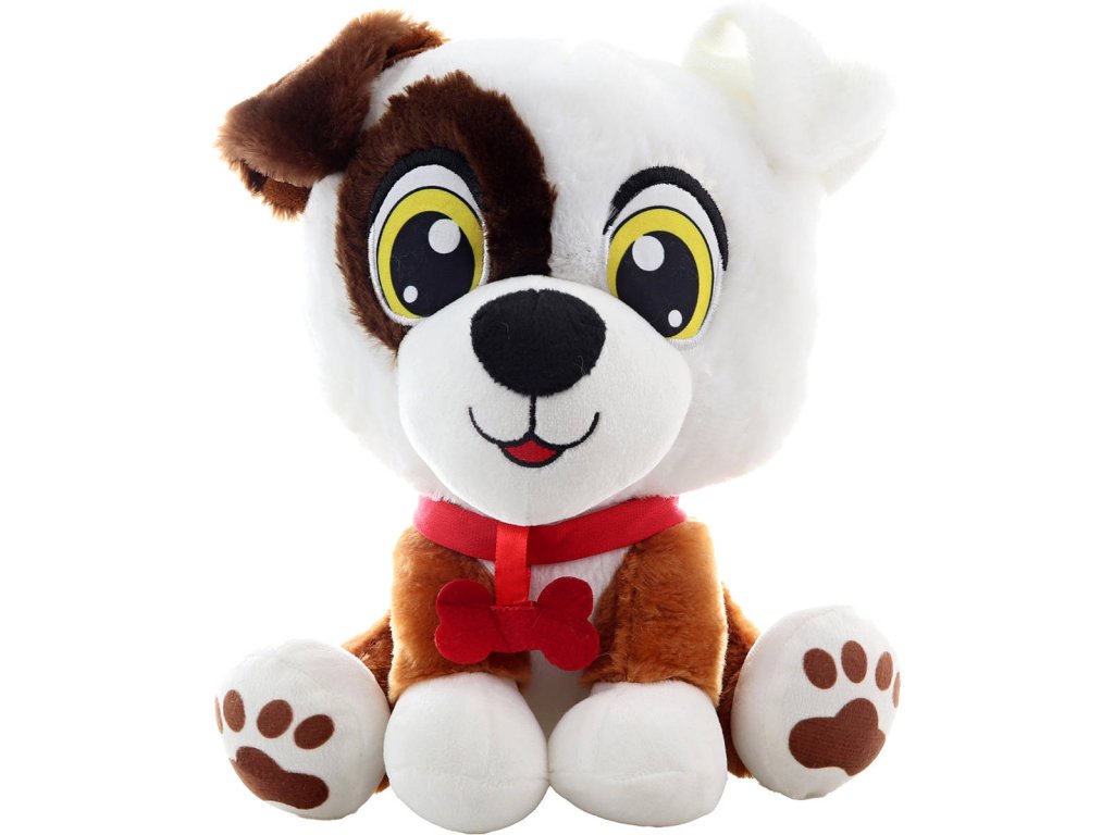 Plyšové zvířátko veselý sedící pes flíček, s kostičkou na krku, velké výrazné oči, plyšák pejsek o velikosti 25cm, psík pro ty nejmenší milovníky plyšových zvířátek.