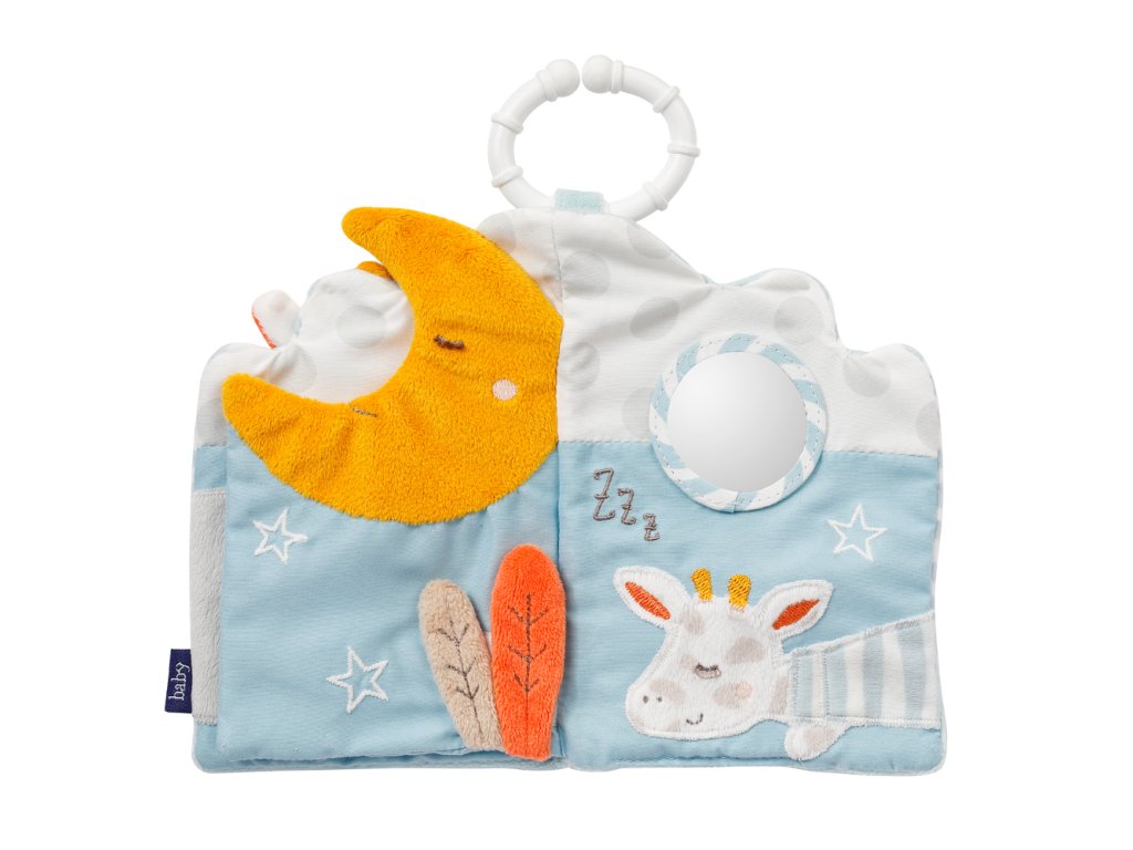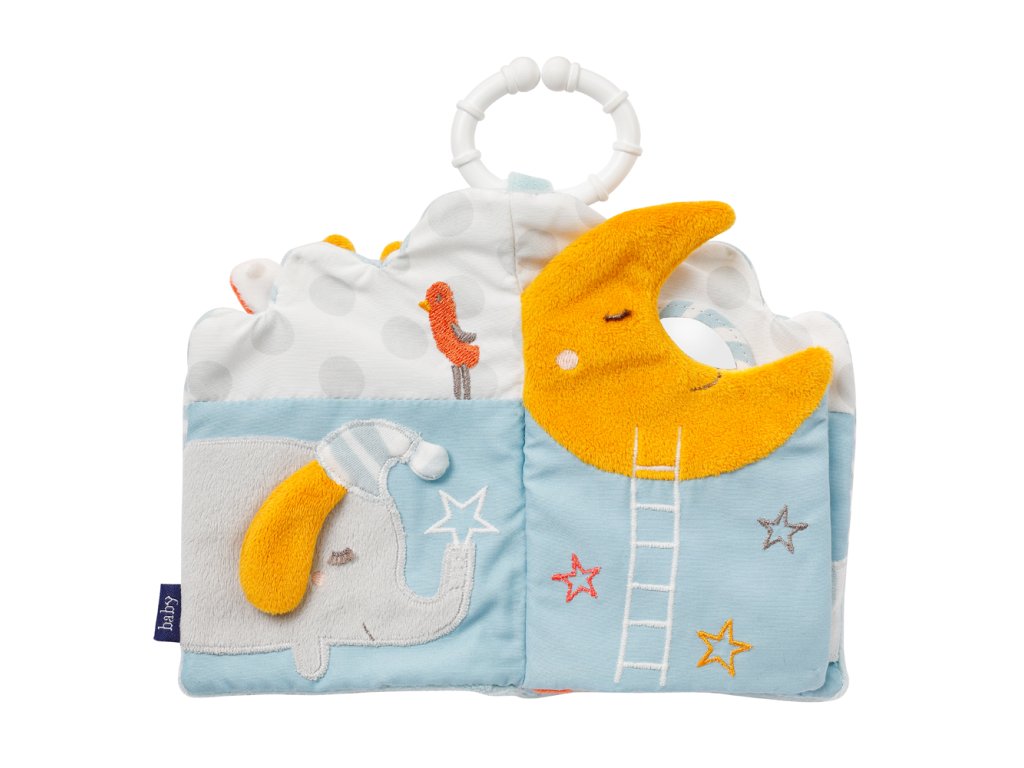 Kniha z měkkého a příjemného veluru děti přímo zve k objevování a rozvoji dovedností u malých dětí. Šestistránková látková kniha je příjemná na dotek a upoutá pozornost zejména díky barevným motivům. Uvnitř najdete pískací hračku, šustivý papír, zrcadlo a obrázky vytvořené z různě barevných látek.