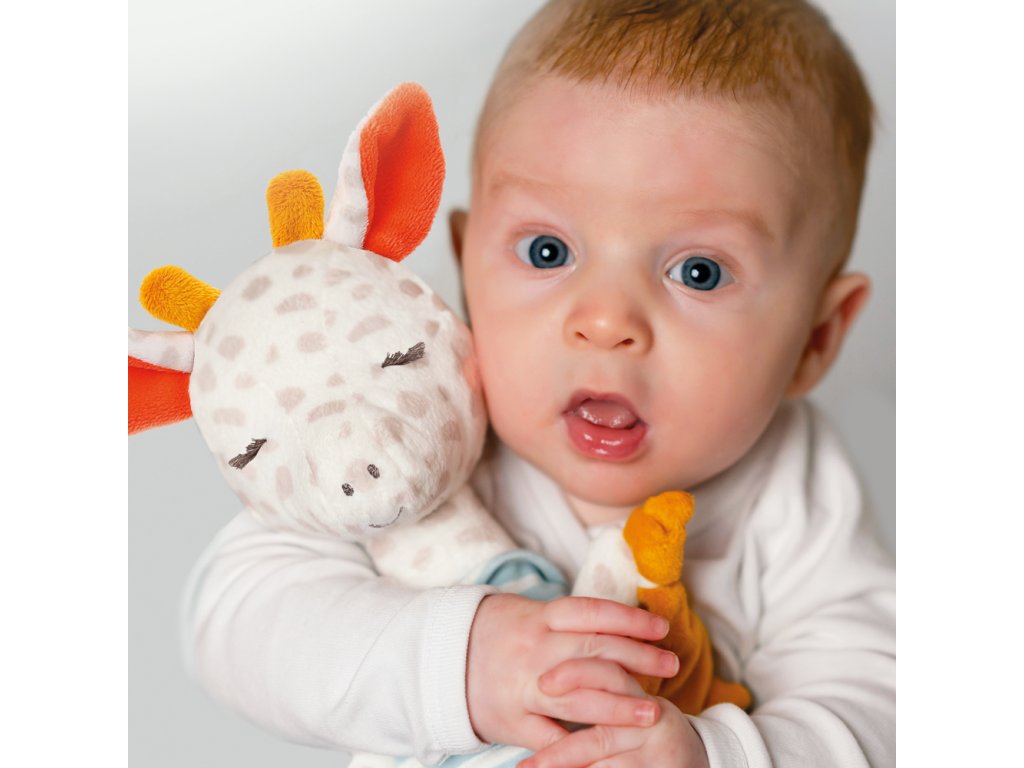 Přes den mazlivá žirafa, která podporuje představivost a v noci ochránkyně klidného spánku – to je plyšová žirafa s plyšovou postýlkou s uchy. Díky několika osvětlovacím prvkům hravě rozptýlí strach dítěte ze tmy a dodá mu pocit, že na něj někdo dává celou noc pozor.