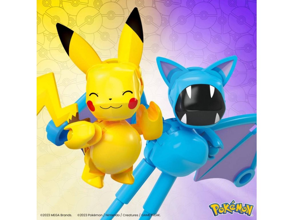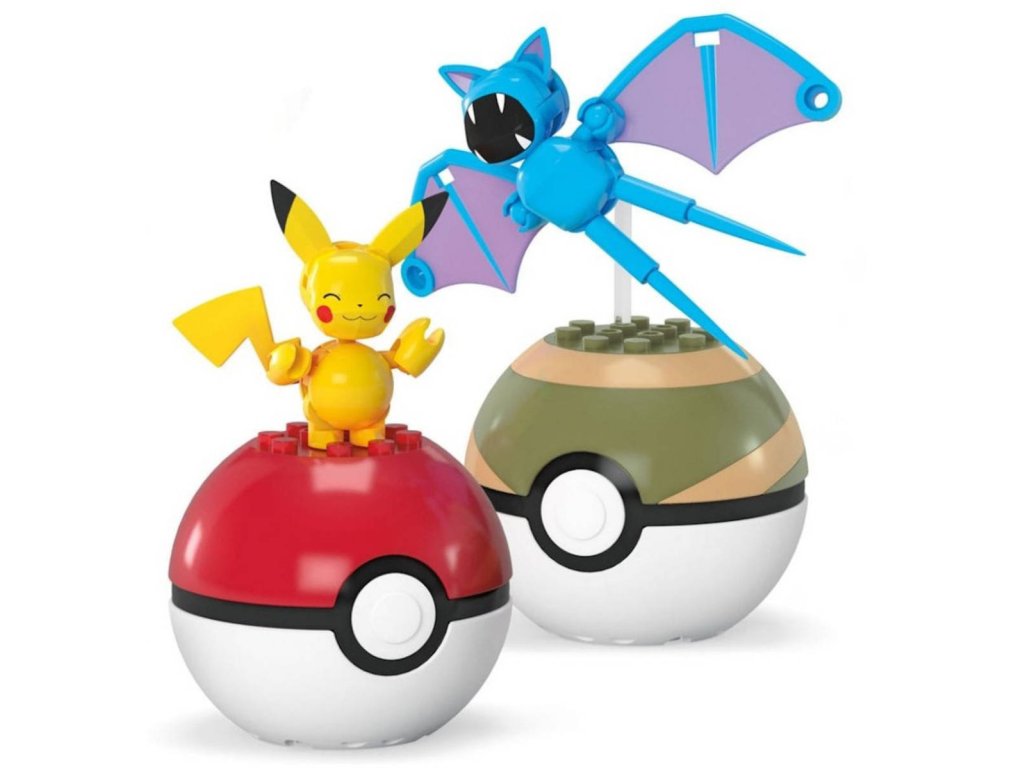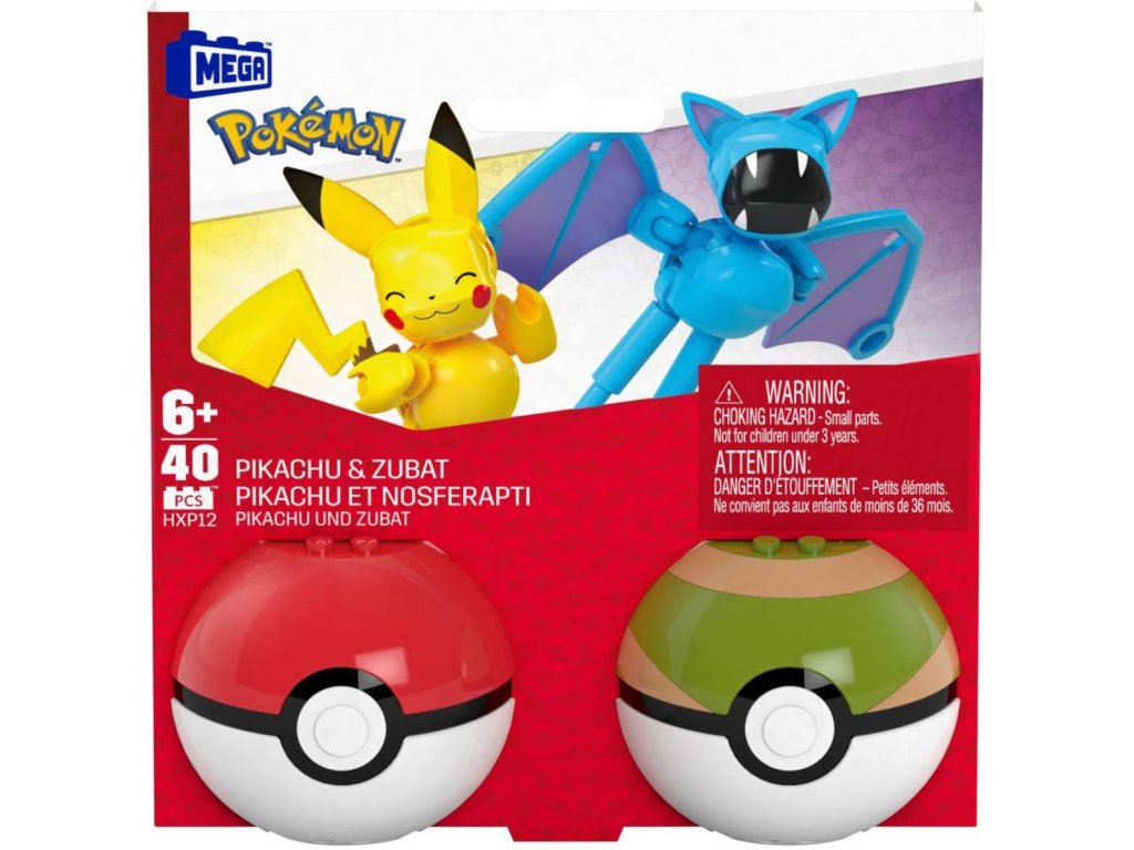 Pokémon MEGA Construction Set. Herní set obsahuje 2 Pokébally a 40 dílků stavebnice pro sestavení Pokémona (Pikachu a Zubat).
