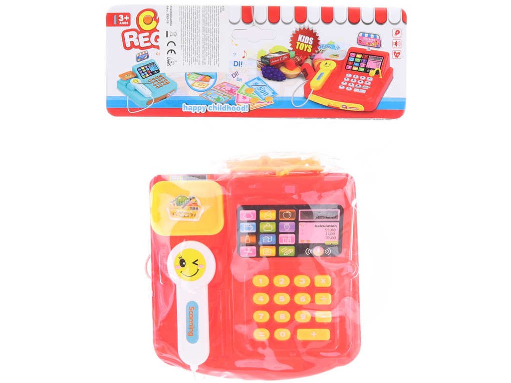 Plastová pokladna s váhou a čtečkou zboží a karet. Součástí jsou plastové dětské peníze a mikrofon. Čtečka vydává zvuky. Baleno v sáčku. Hračka na baterie, se zvukem.