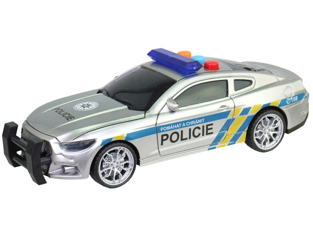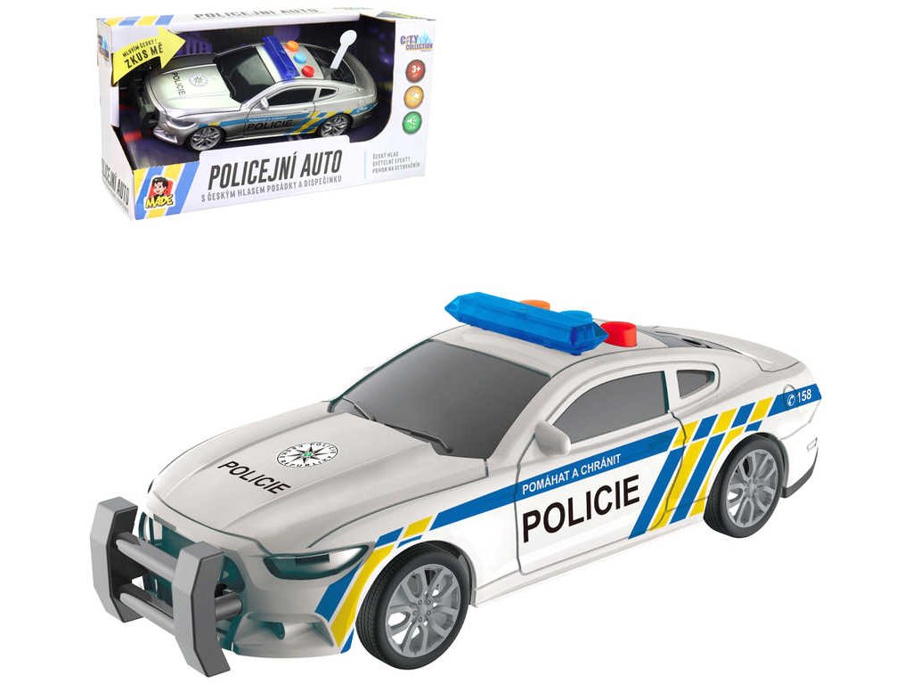 Osobní plastový vůz Policie s pohonem na setrvačník, s grafikou v českém designu (česká policie, realistický vzhled, hlášení v češtině). Hračka se světlem a zvukem, na baterie. Baleno v open boxu.