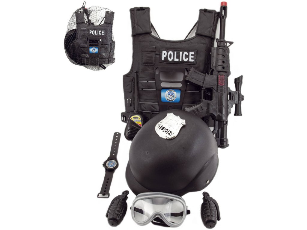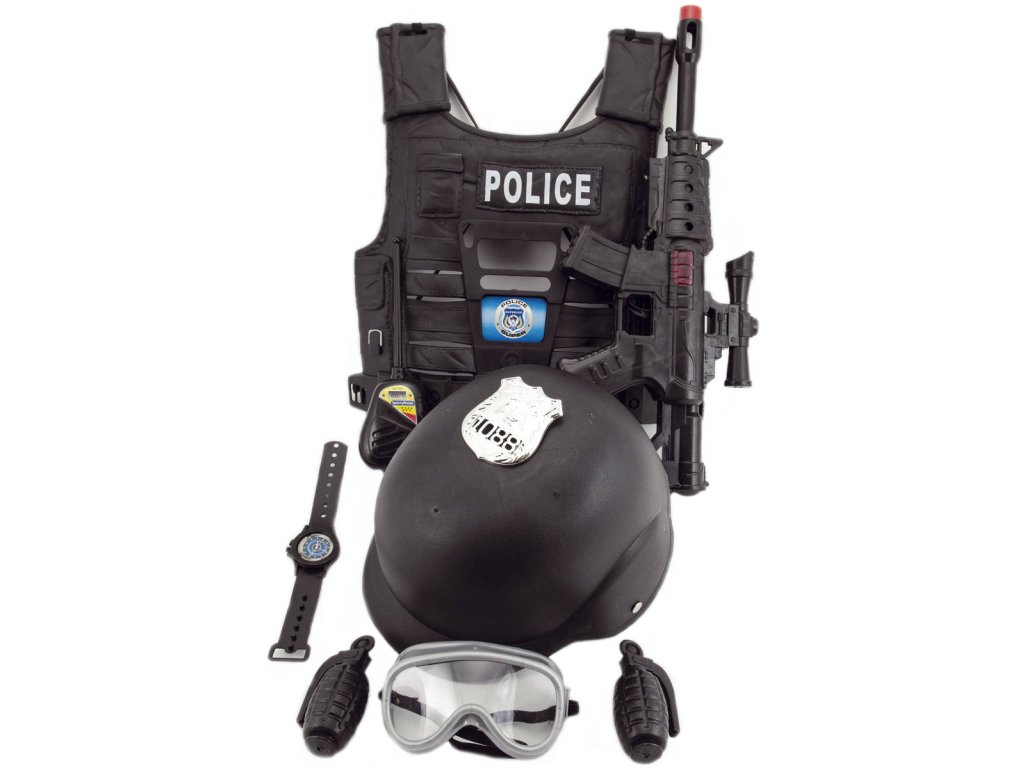 Obsah balení: vesta, dětská zbraň, helma, ochranné brýle, hodinky, granát 2ks, policejní odznak, vysílačka