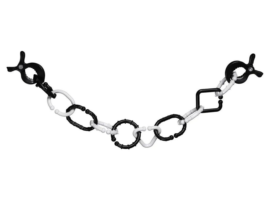 Plastový řetěz na kočárek nebo autosedačku. Plastový řetěz s klipy se skládá z 10 tvarů a 2 klipy, které se snadno připevní na postýlku nebo kočárek. Černé a bílé zbarvení dokonale stimuluje smysl zraku dítěte, které ještě nerozlišuje barvy.