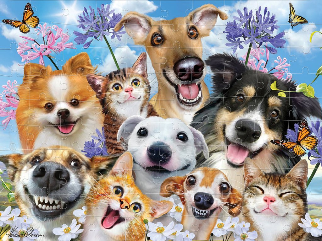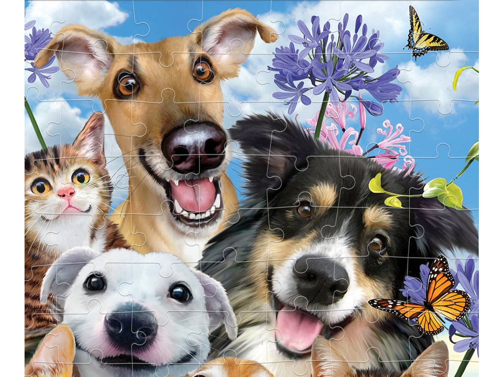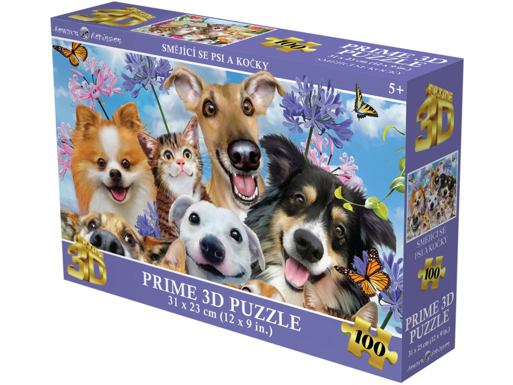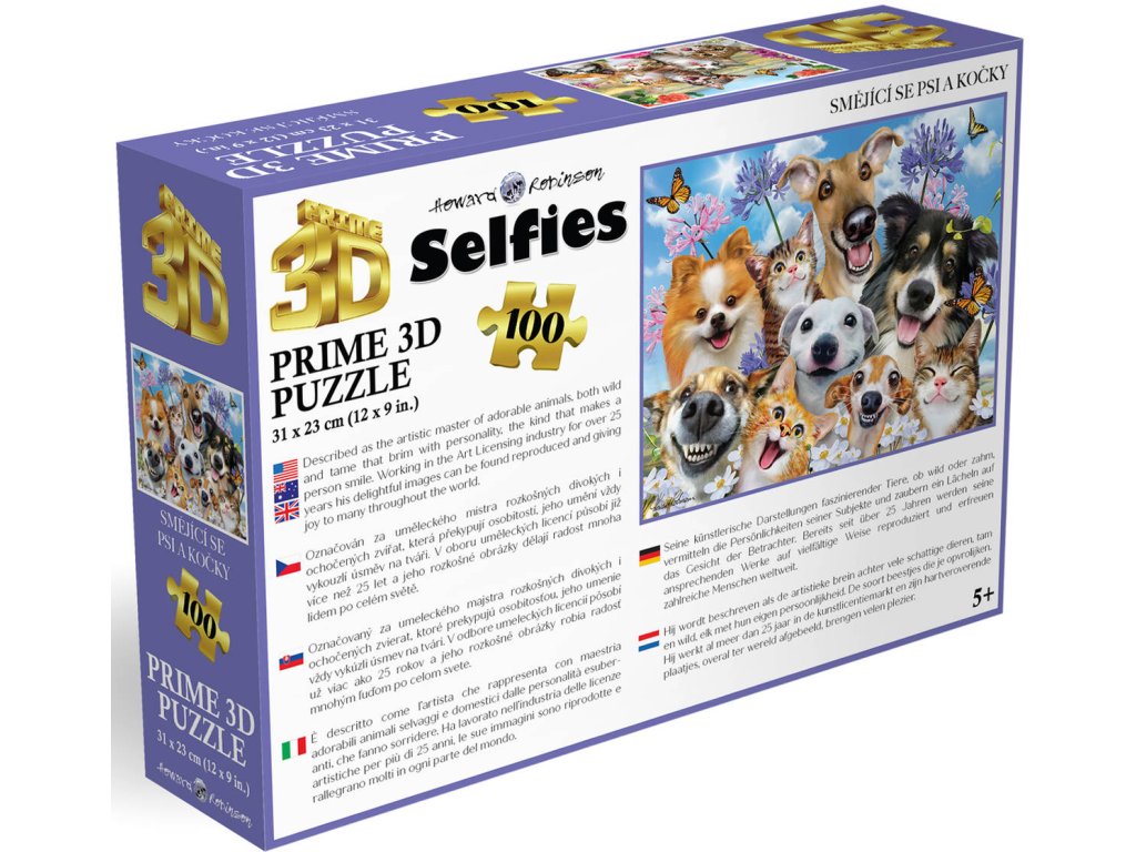 Kvalitní Prime 3D puzzle skládačka s motivem Pejsci a kočičky (selfie). 100 dílků, velikost motivu 31 x 23cm, prostorový holografický efekt při změně úhlu pohledu.