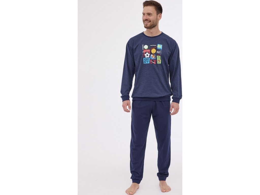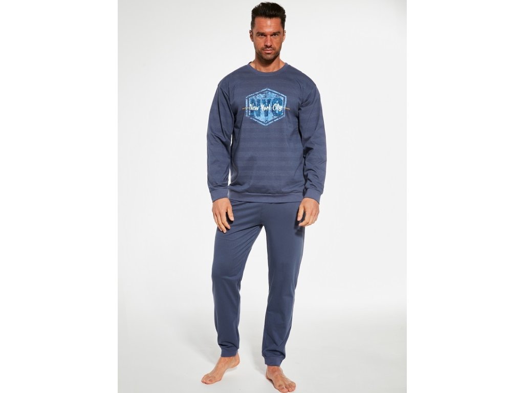 Pánské pyžamo ušité z kvalitní bavlny. Horní díl s kulatým výstřihem a dlouhými rukávy zakončené patenty. Jednobarevné kalhoty zakončené úpletem. Pyžamo je baleno ve stylové krabičce.