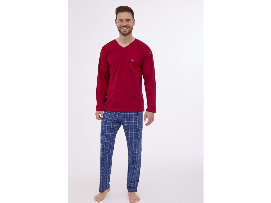 Pánské pyžamo z kvalitní bavlny. Horní vzorovaný díl má dlouhé rukávy a na přední straně kapsičku. Kalhoty jsou dlouhé, jednobarevné a volné. Pyžamo je balené ve stylové krabičce.