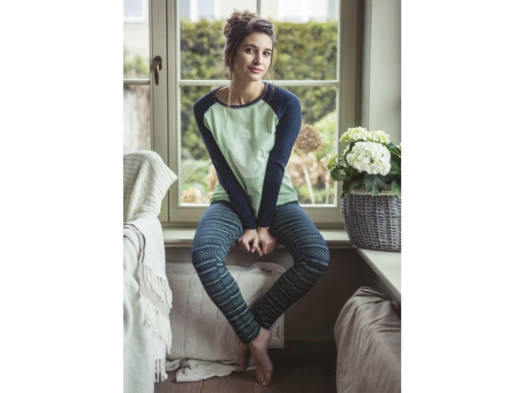 Dámské pyžamo nebo domácí oblečení s dlouhými rukávy a aplikací na horním dílu a vzorovanými přiléhavými kalhotami. Baleno v transparentním obalu.
