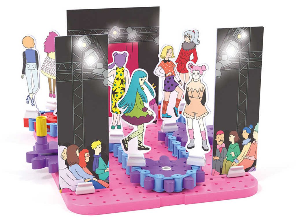 Pohyblivá převodová stavebnice Fashion Show umožňuje dětem od 3 do 7 let postavit na základní desce dvě různá prostředí – pódium s přehlídkovým molem a šatnu v zákulisí. Na plastový řetěz pohybující
