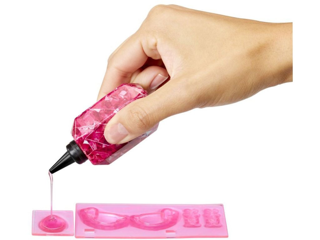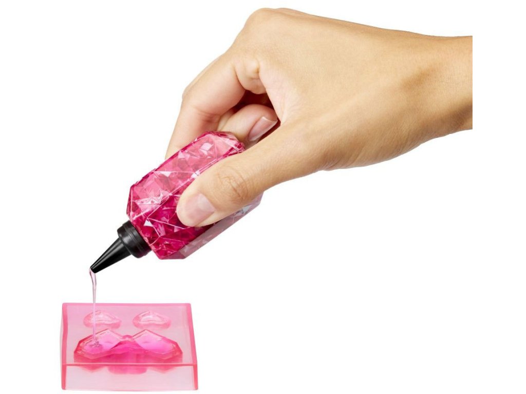 Nalijte pryskyřici do formy. Nechte ji několik minut vytvrdnout na slunci. Poté krystal vyjměte z formy a zacvakněte ho do doplňku. Pak si můžete hrát s panenkou a všemi krásnými krystalovými doplňky.