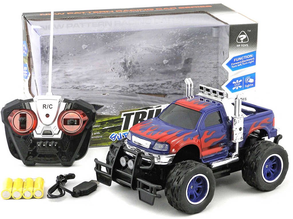 RC Akční automobil offroad na velkých kolech na dálkové ovládání. Plná funkce, 27MHz. Hračka na baterie, se světlem. Baleno v krabici s průhledem.