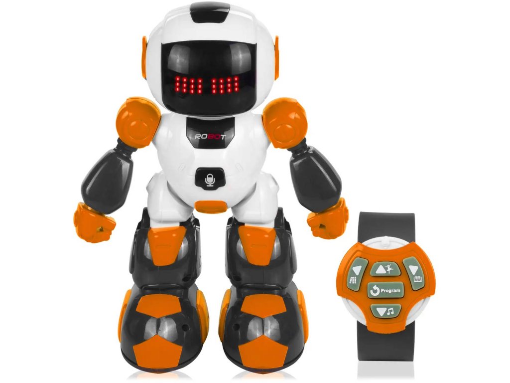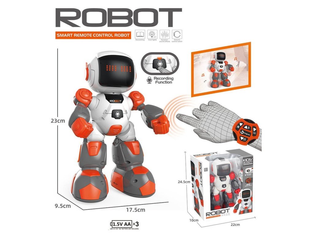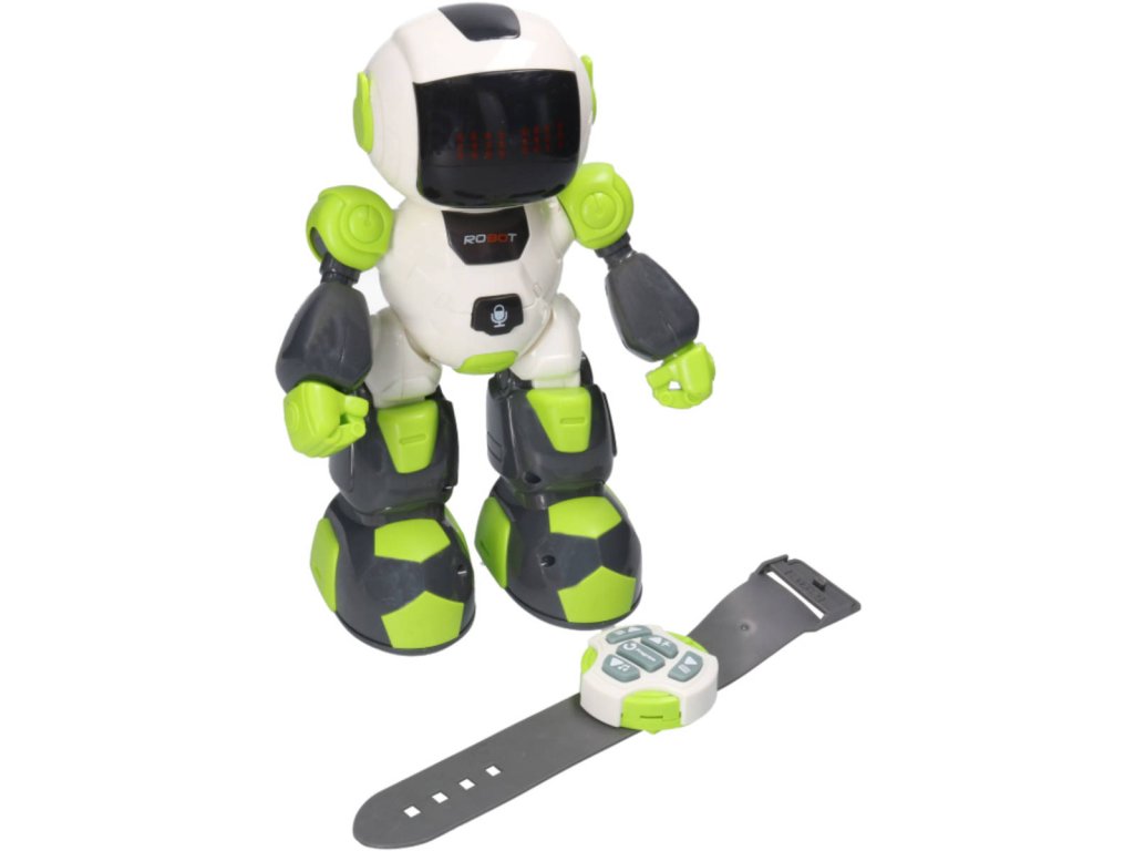 RC Robot na dálkové ovládání, s funkcí nahrávání REC, ovladač ve formě hodinek, velikost 23cm, chodí a tančí. Hračka na baterie, se světlem a zvukem.