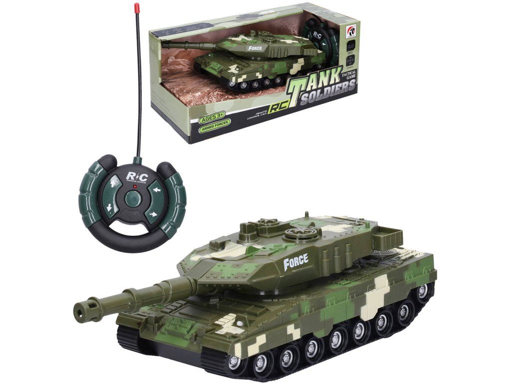 RC Tank vojenský s potiskem Maskáč na dálkové ovládání. Pohyb dopředu, dozadu, doleva, doprava + efekty. Velikost 28cm, 27MHz, USB kabel součástí. Hračka na baterie, se světlem a zvukem.