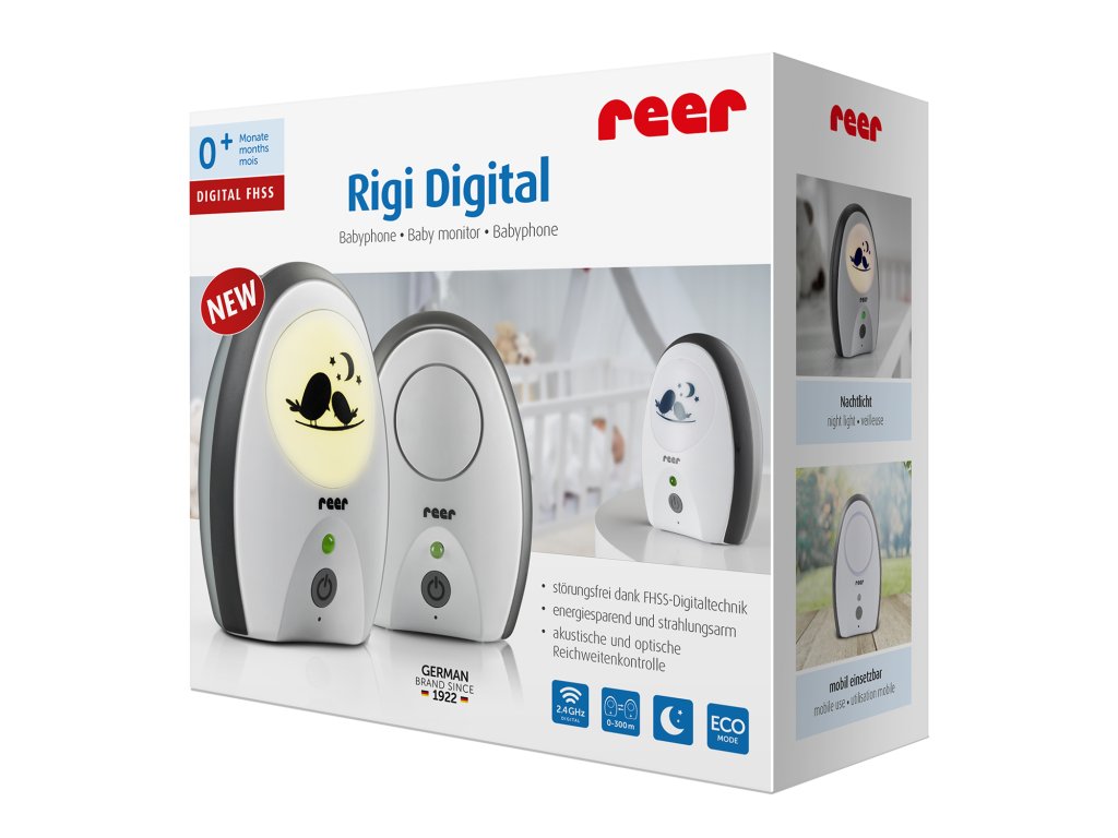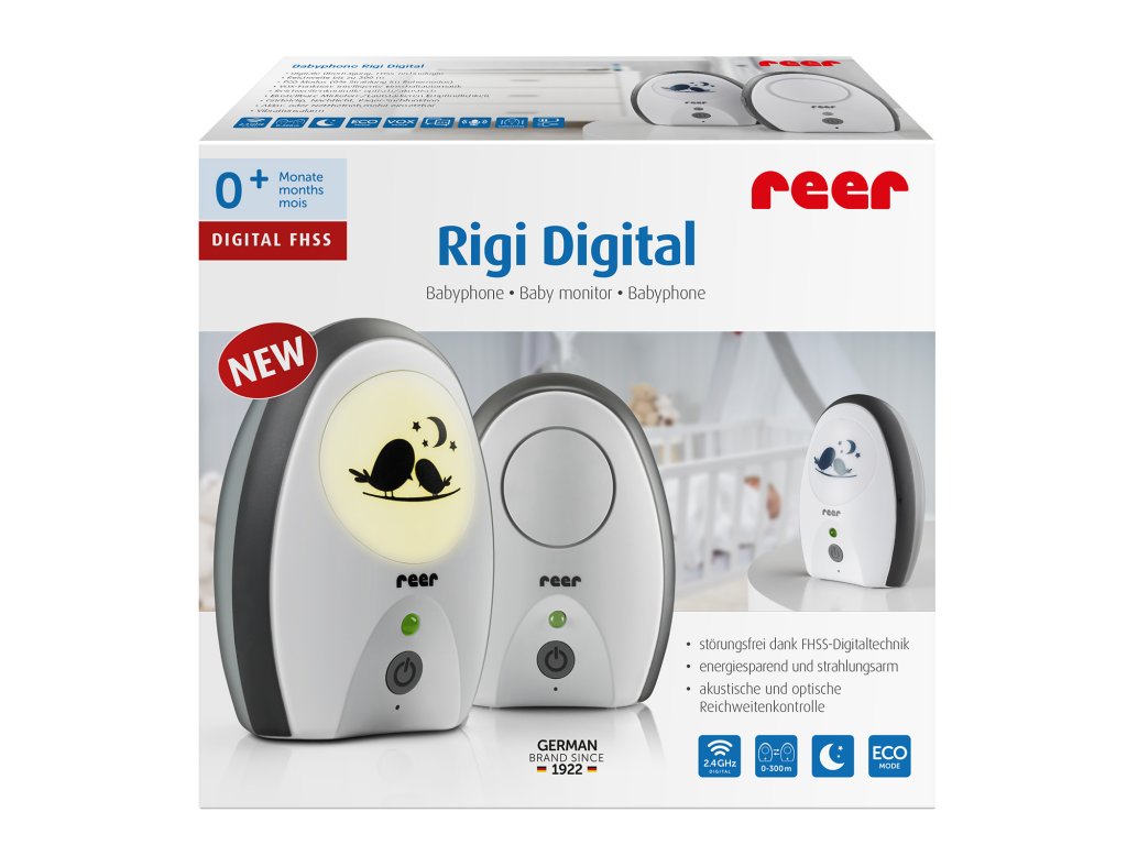Digitální dětský monitor Rigi sleduje dokonale propojenou kombinaci dětské a rodičovské jednotky se spícím dítětem. Díky FHSS (Frequency Hopping Spread Spectrum) je zaručen bezporuchové a křišťálově čisté spojení. Díky automatické změně pravidelných kanálů je digitální přístroj Rigi 100% odolný proti odposlechu.