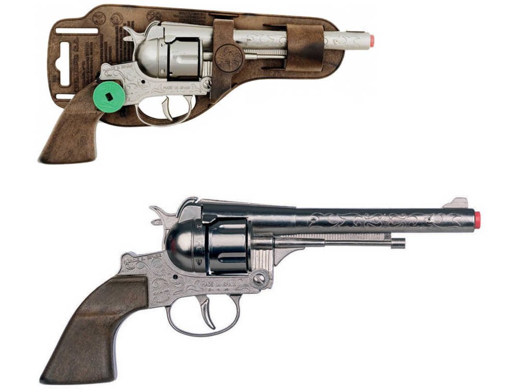 Parádní kovbojský revolver, stříbrná dětská zbraň z kovu a plastu s bubnovým zásobníkem, na kapslíky – 12 ran. Nezbytný doplněk pro všechny malé pistolníky a strážce zákona.