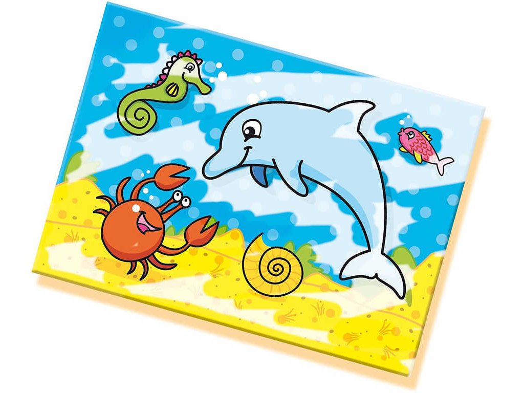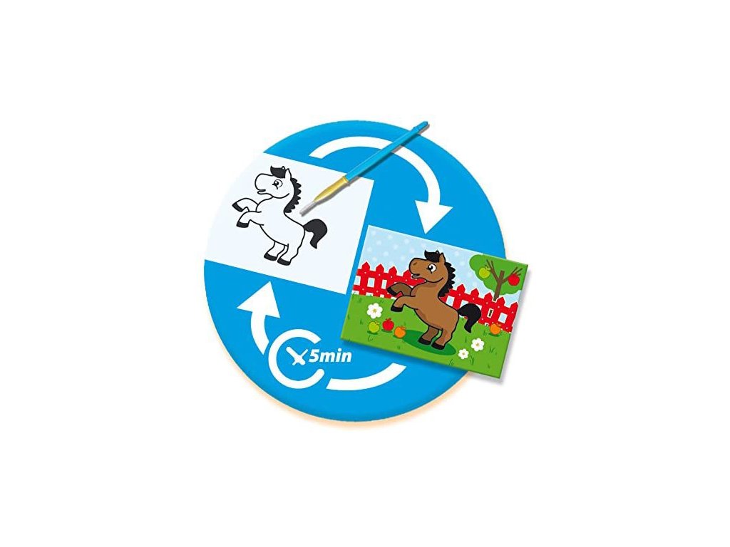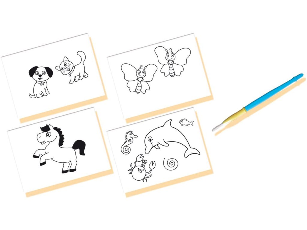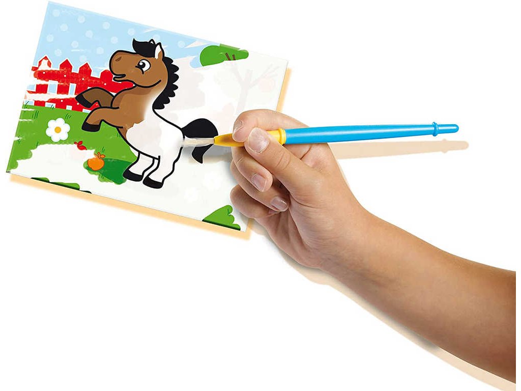 Kouzlení s vodou a barvou bez nepořádku! K tomu slouží tato sada. Mokrým štětcem dítě maluje po kartě a postupně vzniká barevný obrázek. Štětec je bezpečný, protože chloupky nemohou vypadnout.