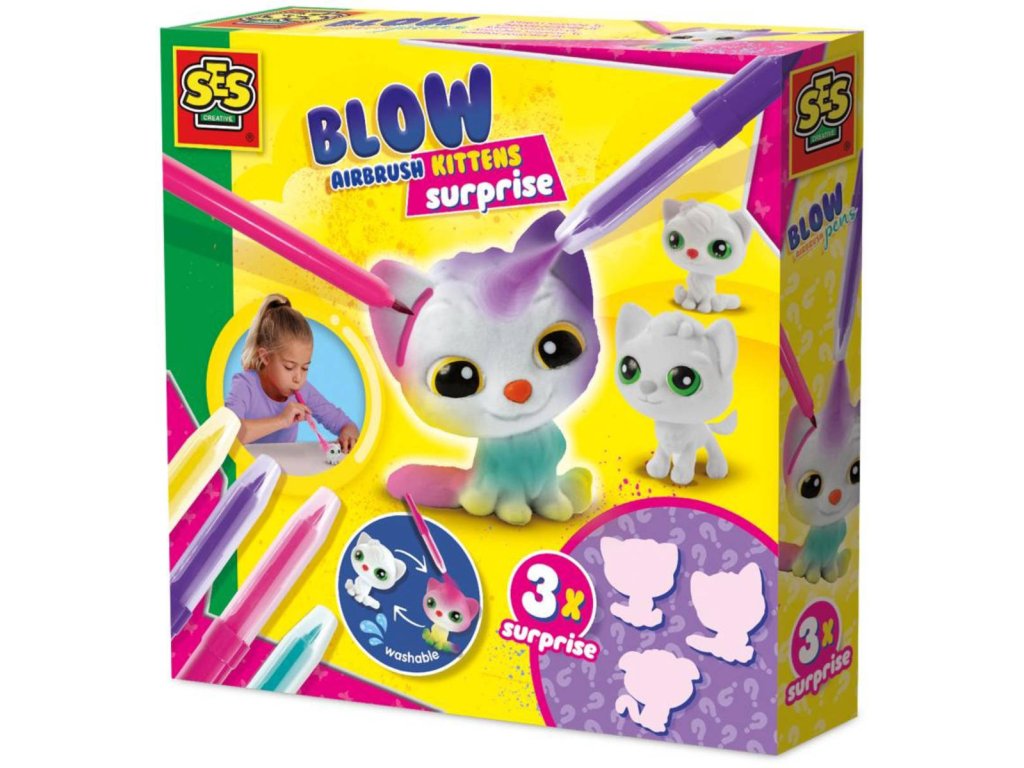 SES CREATIVE Dětský kreativní set. Součástí 4 foukací fixy a 3 náhodné figurky koťátek, s překvapením, k vybarvení. Vodou smývatelné.
