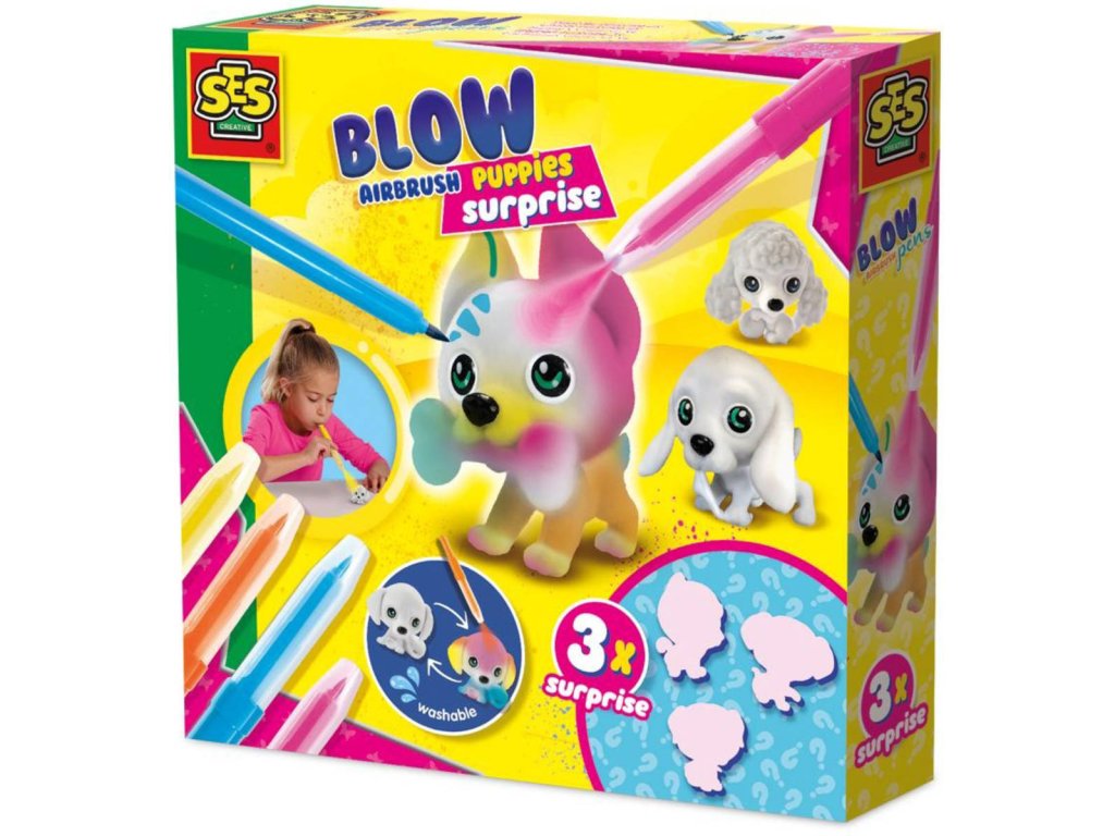 SES CREATIVE Dětský kreativní set. Součástí 4 foukací fixy a 3 náhodné figurky štěňátek, s překvapením, k vybarvení. Vodou smývatelné.