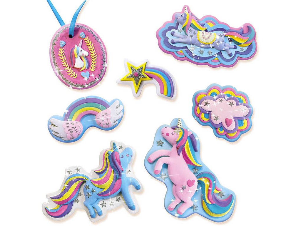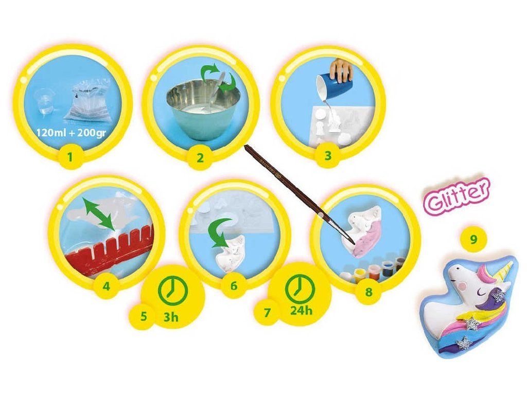 Máte také rádi jednorožce?Tato sada SES Creative vám umožní vytvořit si různé druhy figurek jednorožců vyrobených ze sádry. Nalijte sádru do formy a nechte ji zaschnout.Použijte přiložené barvy a vybarvěte si všechny jednorožce podle svých představ, nakonec posypejte třpytkami. Výsledek je fantastický!