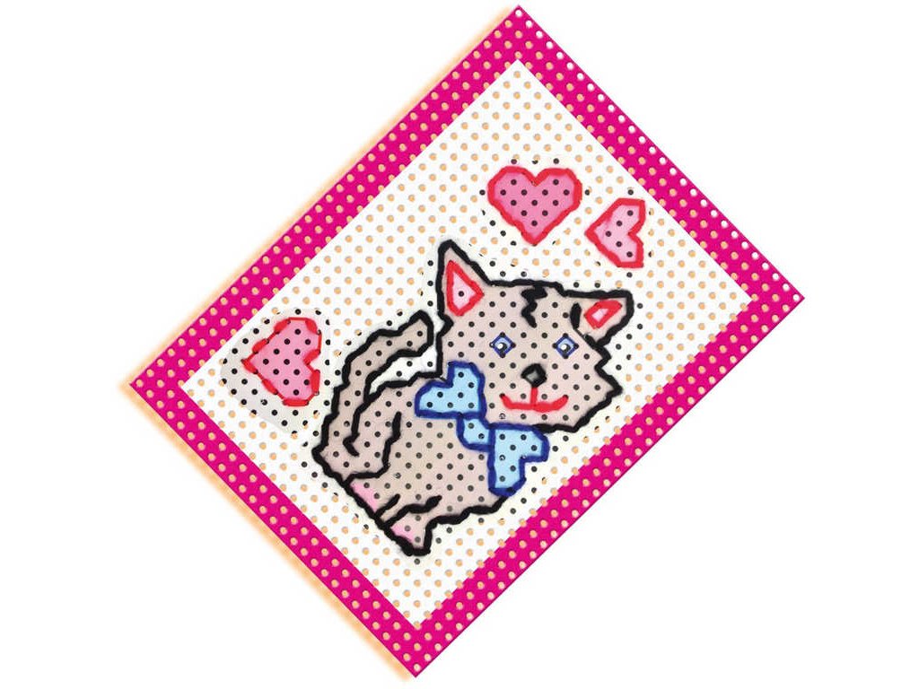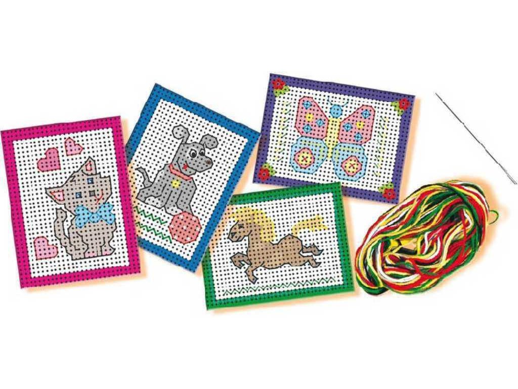 Vyšívací souprava s barevnými předlohami pro malé děti, které baví dělat něco rukama. Obsahuje pevné děrované podložky pro vyšívání různých dětských jednodušších motivů.